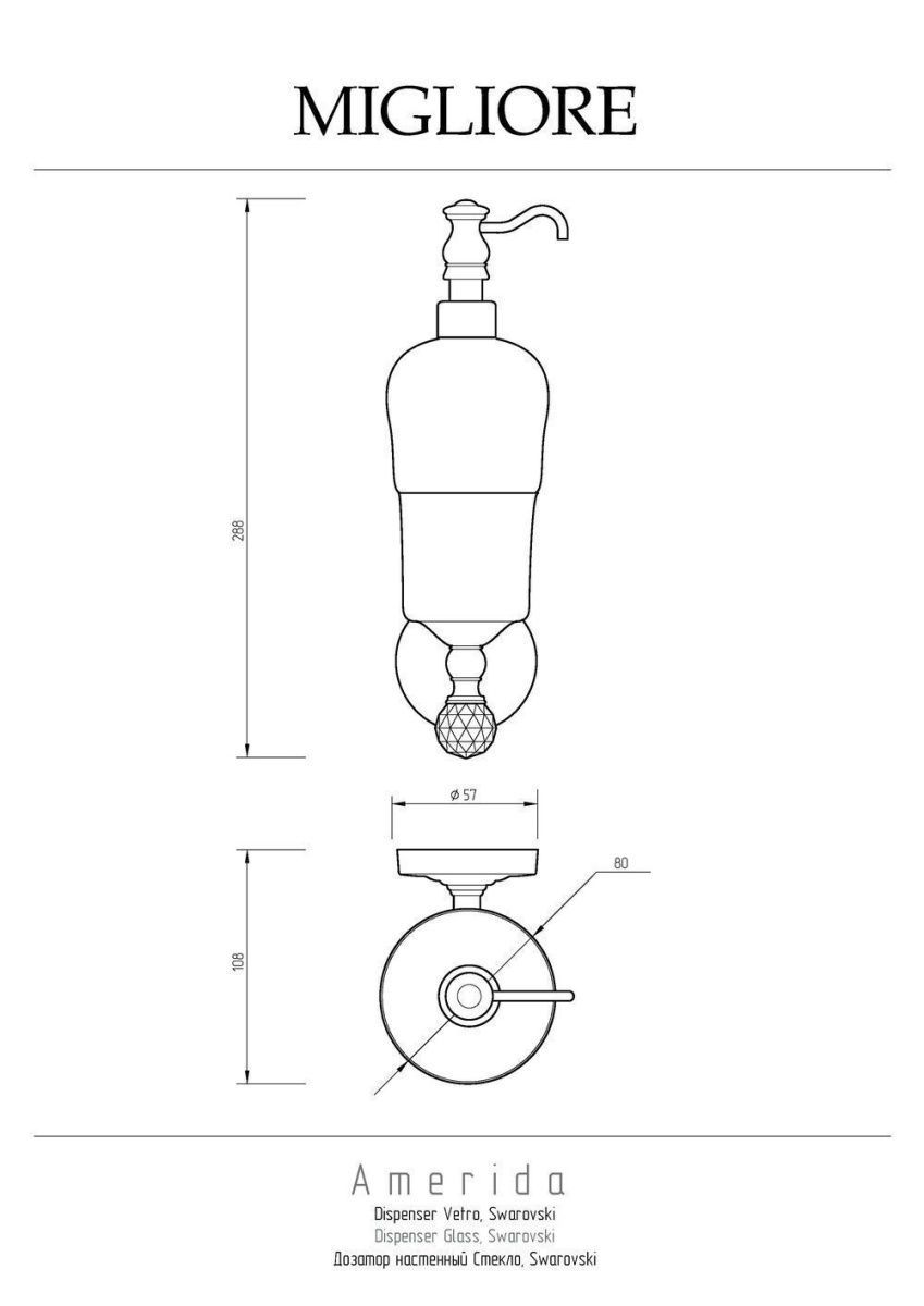 Дозатор настенный коллекции AMERIDA бренда MIGLIORE -один из самых необходимых аксессуаров для ванной комнаты. Аксессуар украшен кристаллом Сваровски. При необходимости дозатор можно вынуть из посадочного места, чтобы помыть