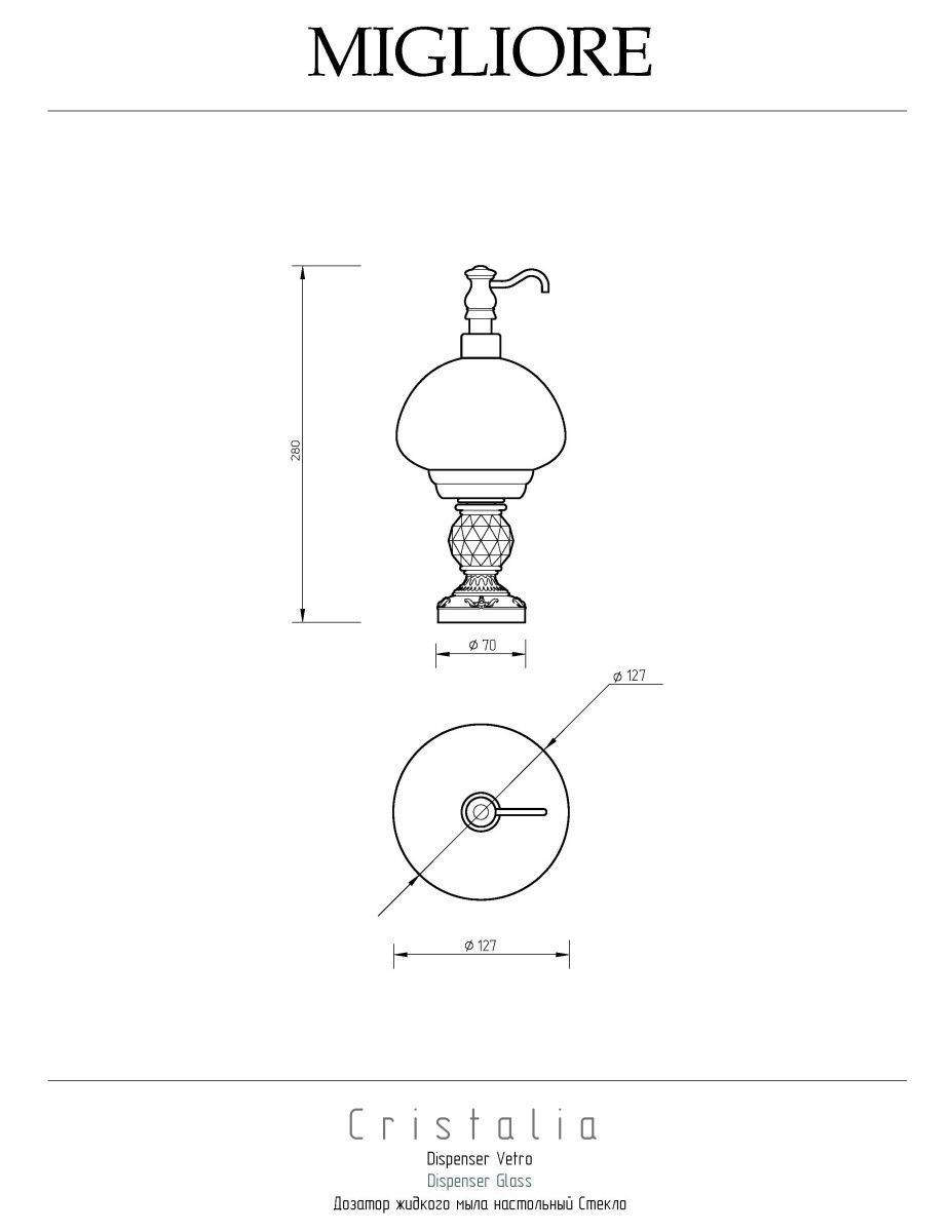 Дозатор настольный коллекции CRISTALIA бренда MIGLIORE -один из самых необходимых аксессуаров для ванной комнаты. Стекло дозатора изготовлено вручную с добавлением фольги из золота, которая, растворяясь в стекле, образует богатый и красивый декор. Аксессуар украшен кристаллом Сваровски. При необходимости дозатор можно вынуть из посадочного места, чтобы помыть