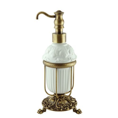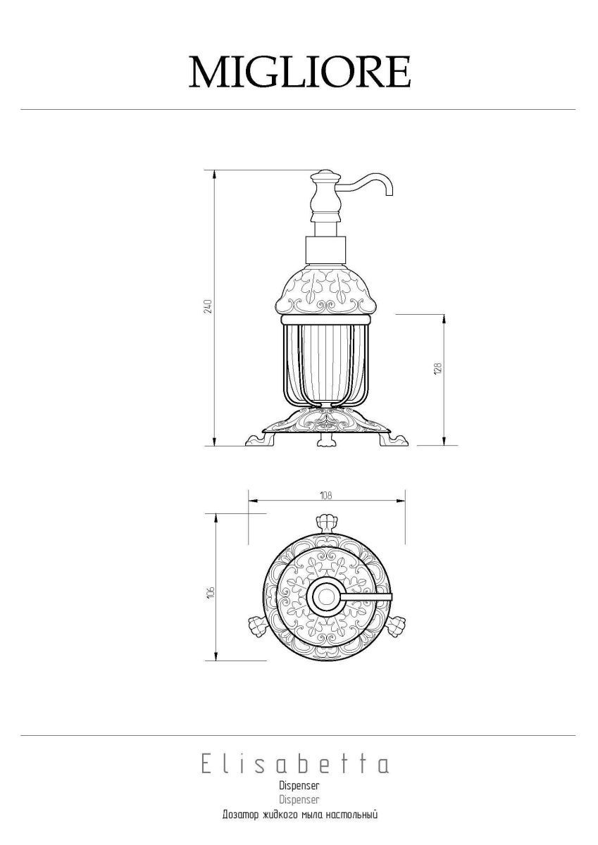Дозатор жидкого мыла настольный с керамической колбой коллекции ELISABETTA бренда MIGLIORE   - один из необходимых аксессуаров, который можно использовать в ванной комнате и на кухне для мыла или моющего средства. Высококачественная белая керамика легко моется, а нажимной механизм имеет эргономичный дизайн. Между керамикой и латунным кольцом имеется уплотнительное пластиковое кольцо, которое надежно удерживает колбу дозатора.