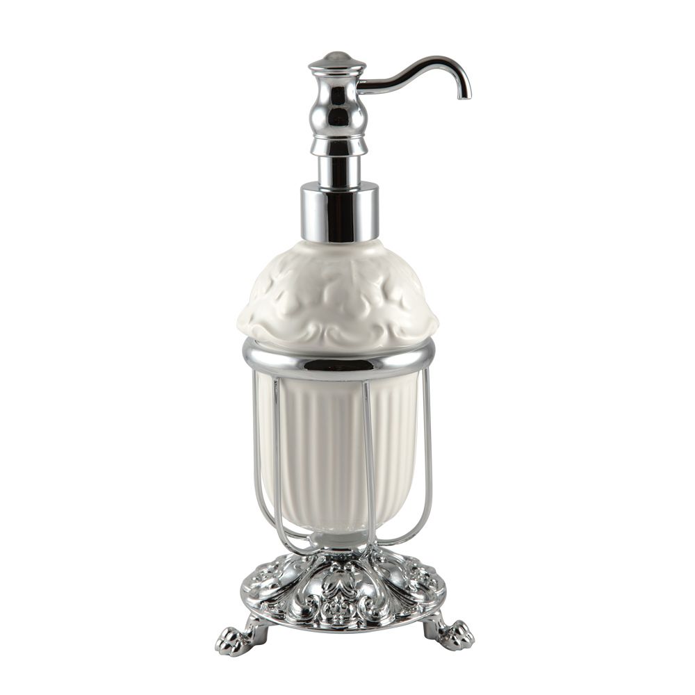 Дозатор жидкого мыла настольный с керамической колбой коллекции ELISABETTA бренда MIGLIORE   - один из необходимых аксессуаров, который можно использовать в ванной комнате и на кухне для мыла или моющего средства. Высококачественная белая керамика легко моется, а нажимной механизм имеет эргономичный дизайн. Между керамикой и латунным кольцом имеется уплотнительное пластиковое кольцо, которое надежно удерживает колбу дозатора.
