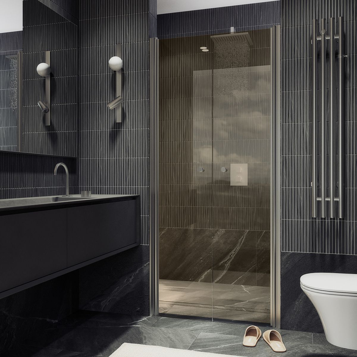 Стеклянная двустворчатая дверь на монопетлях - это стильный и современный элемент интерьера для ванной комнаты. Она изготовлена из прочного закаленного стекла, что обеспечивает ей долговечность и надежность. Монопетли позволяют створки плавно открываться и закрываться для удобства использования.