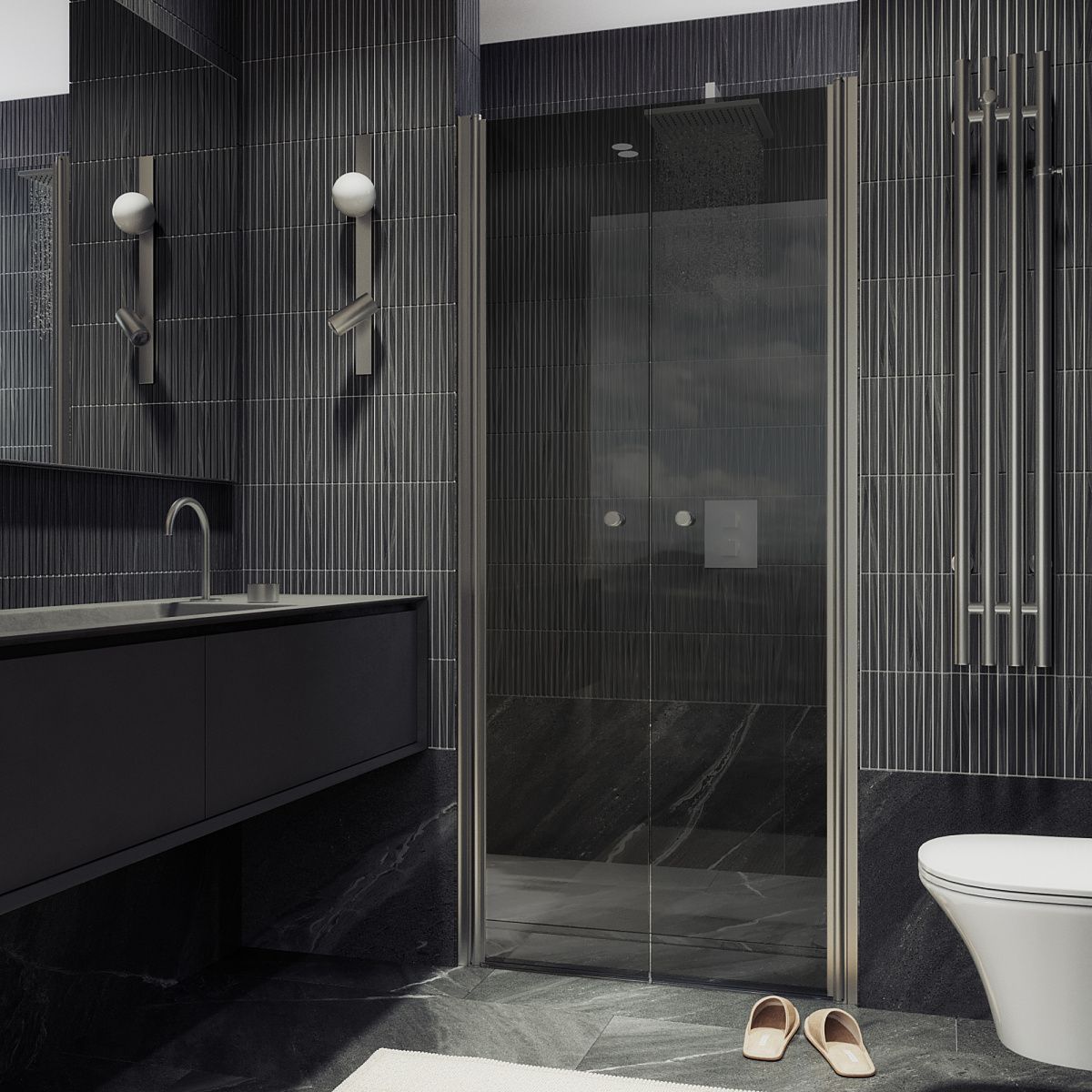 Стеклянная двустворчатая дверь на монопетлях - это стильный и современный элемент интерьера для ванной комнаты. Она изготовлена из прочного закаленного стекла, что обеспечивает ей долговечность и надежность. Монопетли позволяют створки плавно открываться и закрываться для удобства использования.