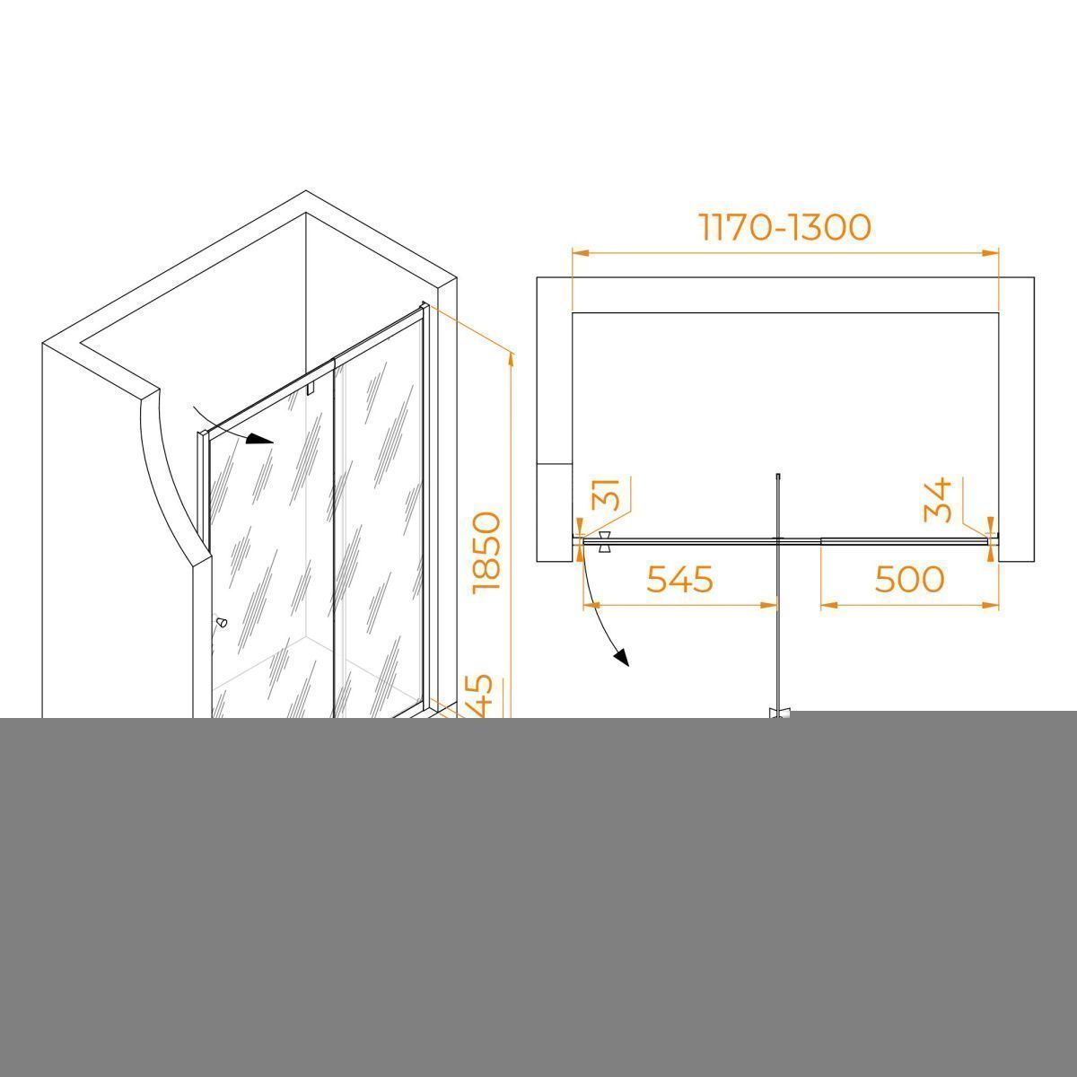 Водонепроницаемые стальные петли обеспечивают прочное крепление двери и высокую надежность, что делает эту душевую дверь идеальным выбором для каждого дома. Общая высота конструкции - 1850 мм.