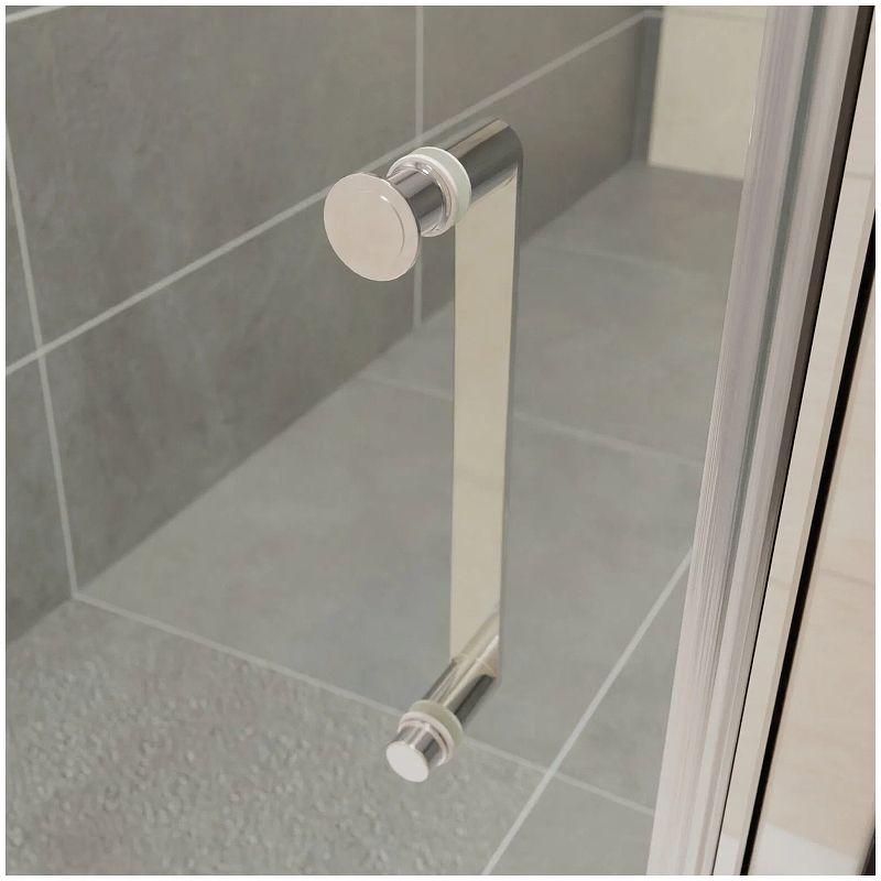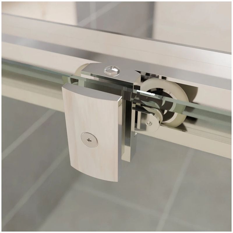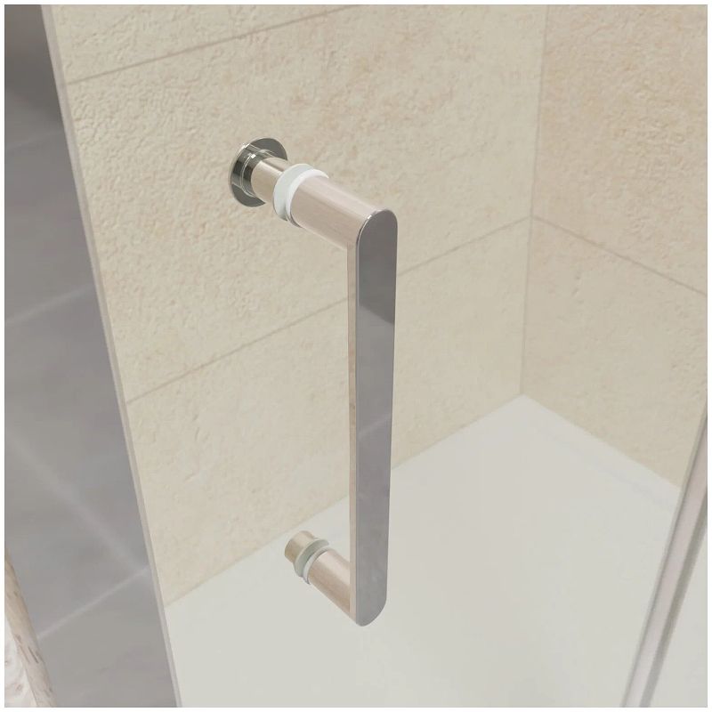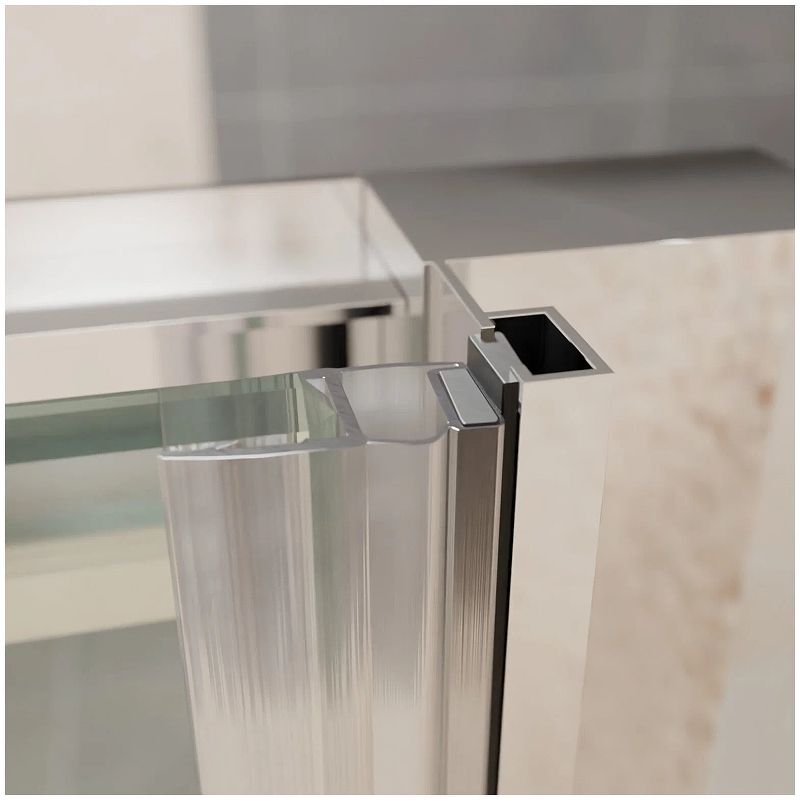 Толщина стекла двери составляет 6 мм и обладает высокой прочностью. Материал стекла выбран прозрачный, что позволяет сохранить пространственную свободу и прозрачность в ванной комнате. Цвет профиля двери выполнен в хромированном исполнении и добавляет глянцевый блеск интерьеру ванны.