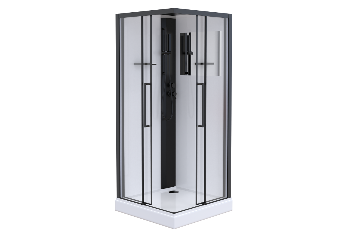 Низкий (125мм) поддон с бортиками по периметру. Съёмный экран высотой 75мм. Сифон с гидрозатвором. Лицевые прозрачные стекла (5 мм) с покрытием Easy Clean. Задние стенки - "супербелое" крашенное стекло (5мм), покрытое защитной плёнкой. Замковое соединение профилей. Профиль алюмииевый (черный матовый). Функциональноая панель из ПВХ.  Душевая лейка с регулируемым держателем. Двойные (спаренные) верхние ролики, внизу блок скольжения. Крыша - "супербелое" крашенное стекло (6мм), покрытое защитной плёнкой. Верхний душ из нержавеющей стали.
