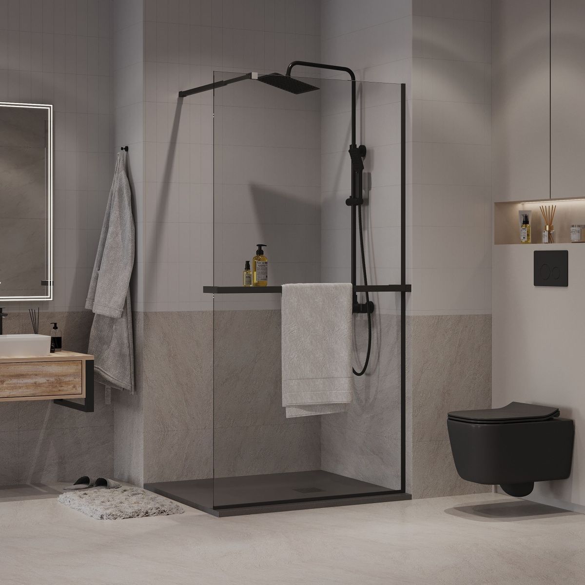 В комплекте с перегородкой идет полка-вешалка, которая с одной стороны крепится к стене, с другой стороны к стеклу. Полку можно повесить на удобную высоту. Это дополнение позволит рационально использовать пространство для хранения ванных принадлежностей.