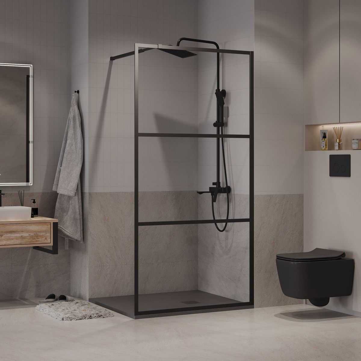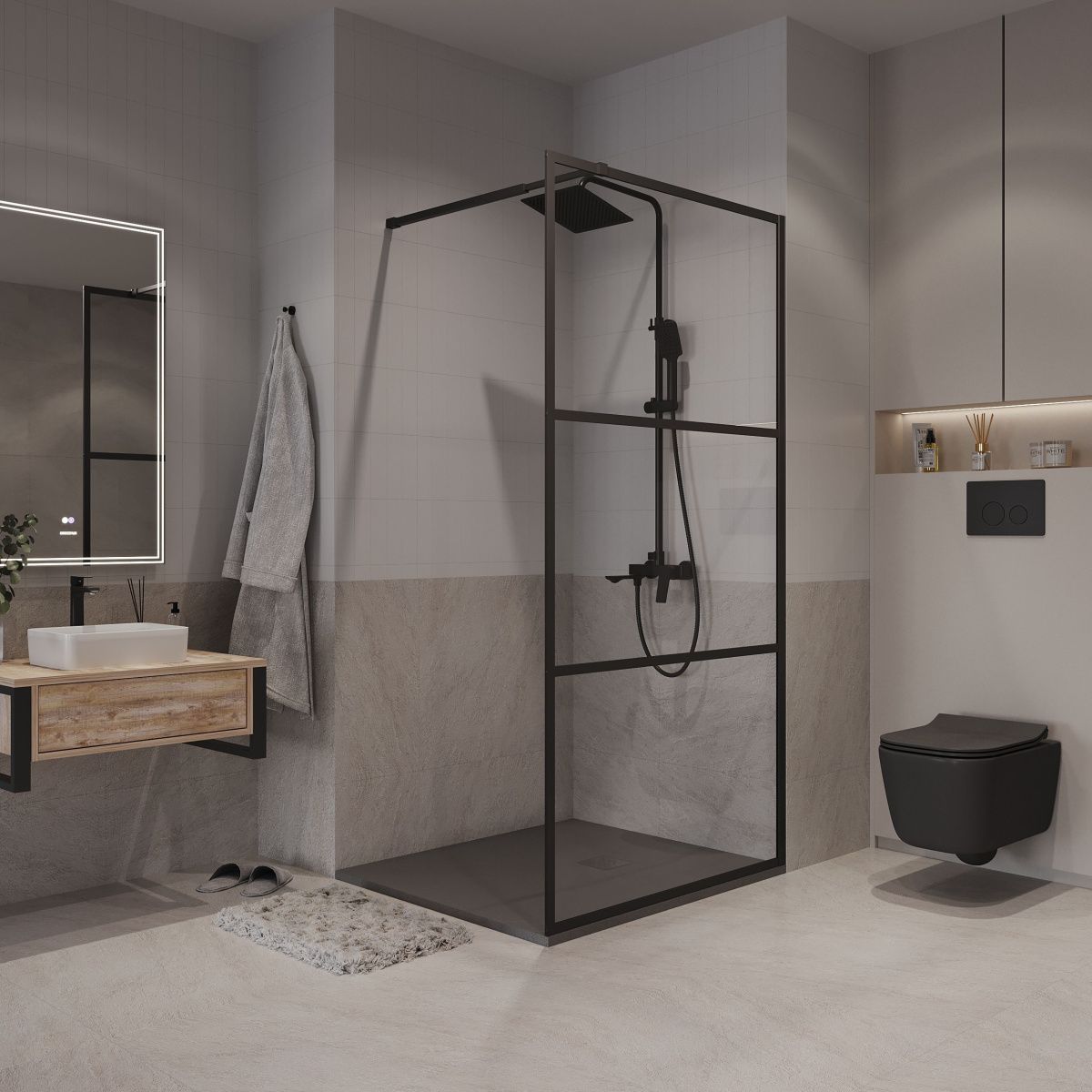 Телескопическая штанга с регулировкой от 700 до 1200 мм позволяет легко адаптировать душевую перегородку к различным размерам душевого пространства, обеспечивая идеальную посадку и плотное прилегание к стенам. Черный матовый профиль на стекле придает ограждению современный и стильный вид, который гармонично впишется в любой дизайн ванной комнаты. Душевая перегородка состоит из 3 стекол с черным обрамлением.