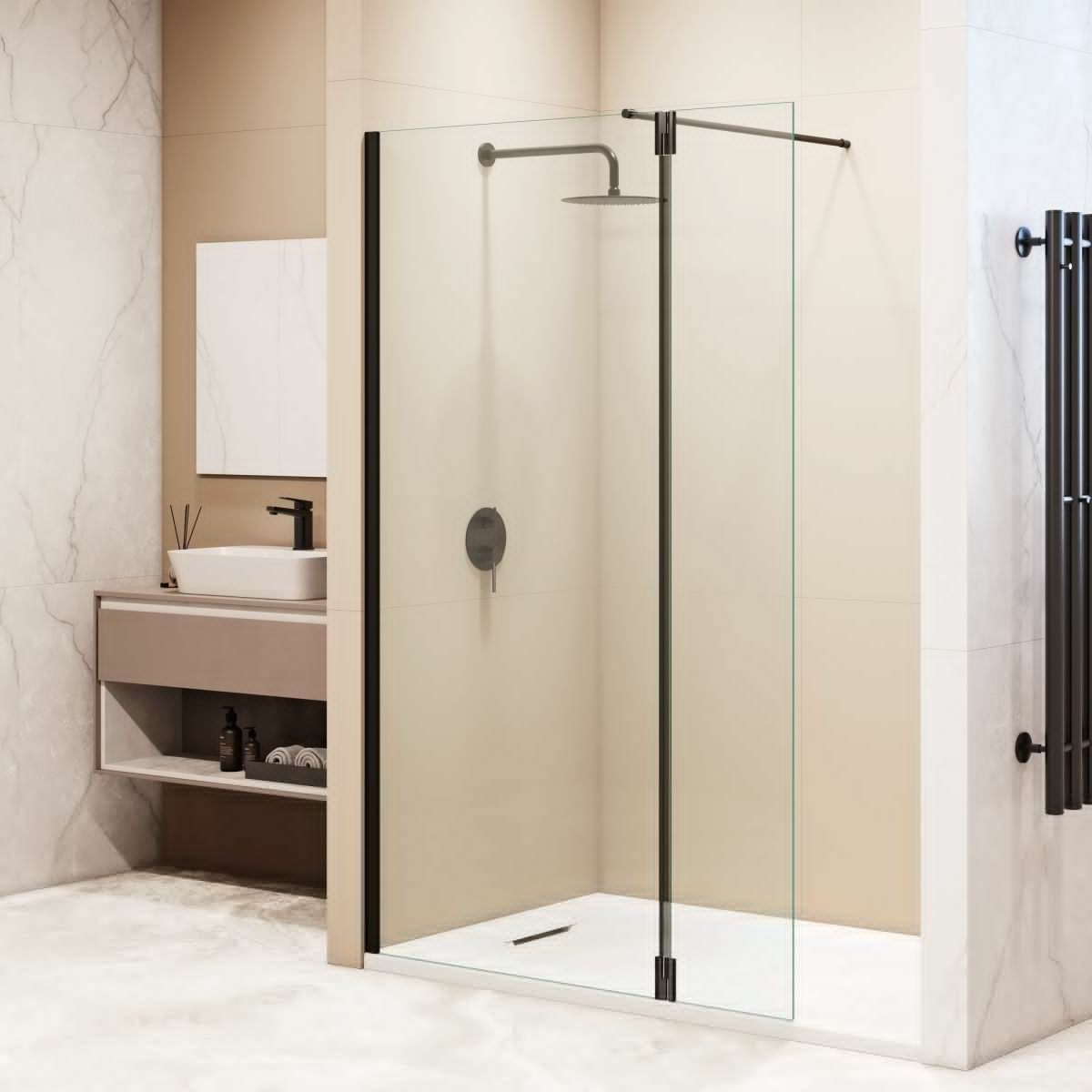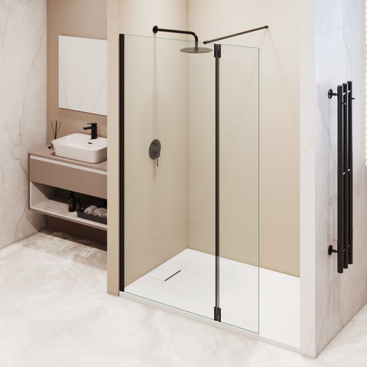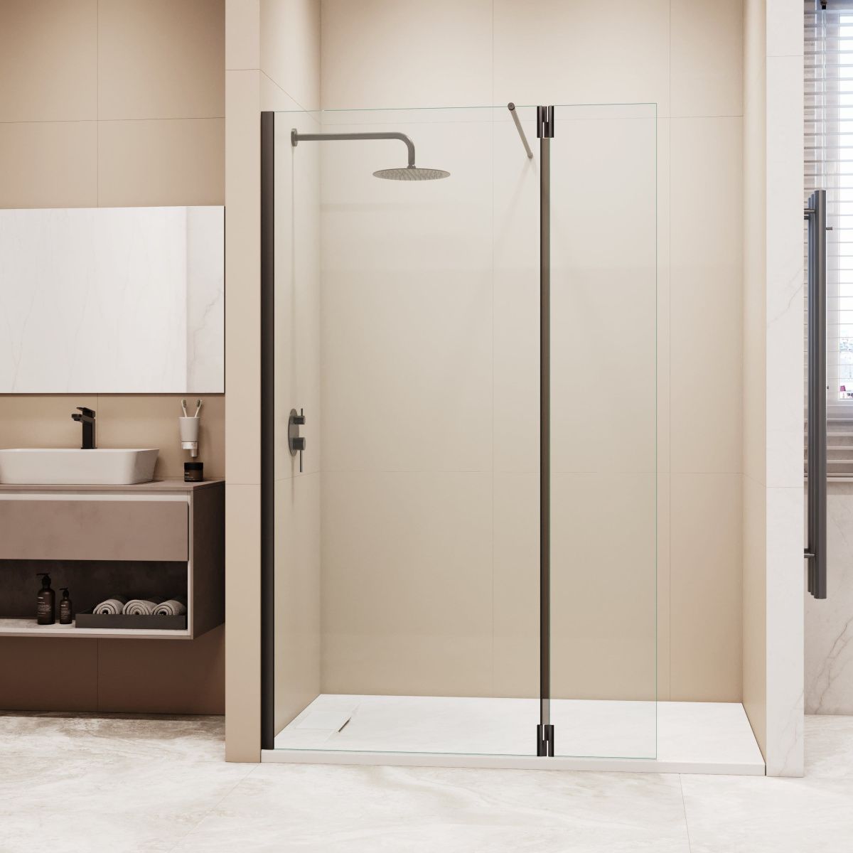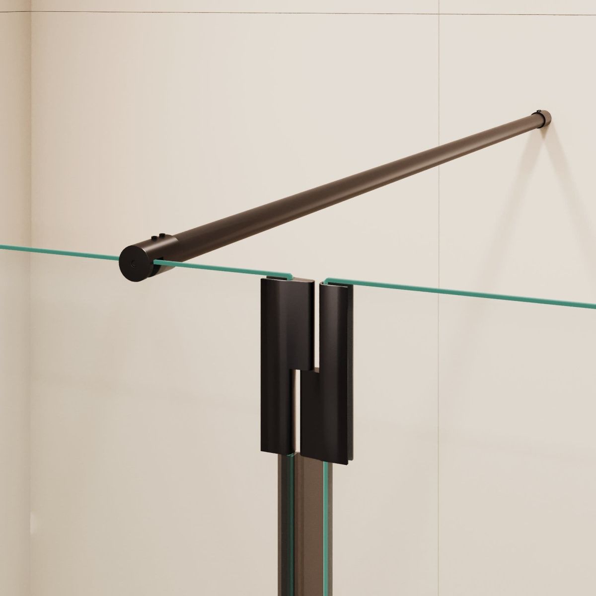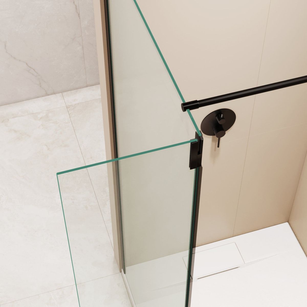 Петли оснащены герметичным поворотным механизмом с маятниковой системой, что позволяет открывать приставное стекло наружу для комфортного доступа в душевое пространство или закрывать внутрь, частично закрывая вход для предотвращения брызг в процессе принятия водных процедур.