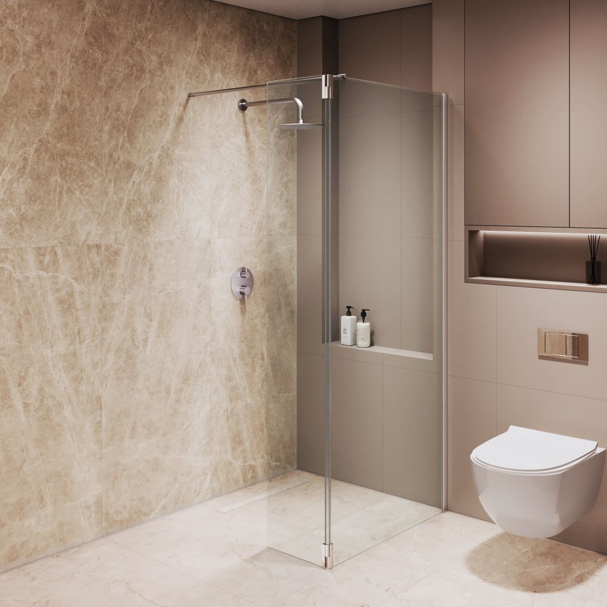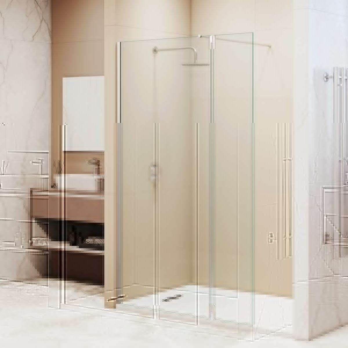 Петли оснащены герметичным поворотным механизмом с маятниковой системой, что позволяет открывать приставное стекло наружу для комфортного доступа в душевое пространство или закрывать внутрь, частично закрывая вход для предотвращения брызг в процессе принятия водных процедур.