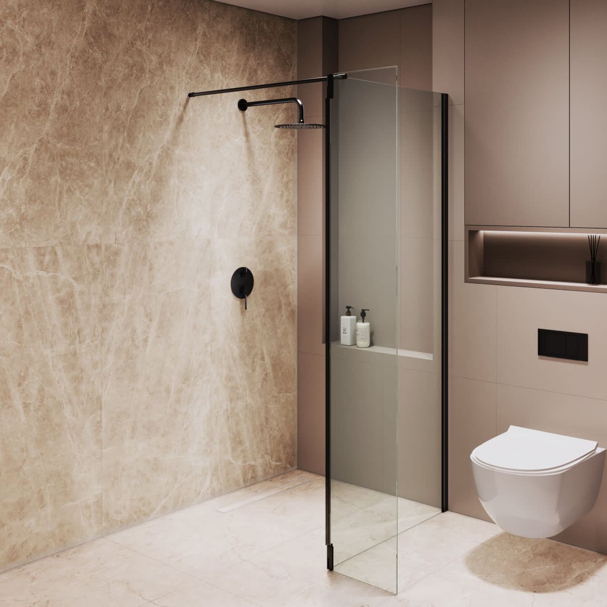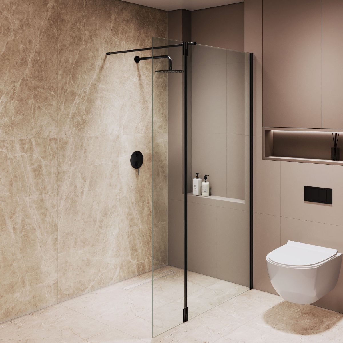 Петли оснащены герметичным поворотным механизмом с маятниковой системой, что позволяет открывать приставное стекло наружу для комфортного доступа в душевое пространство или закрывать внутрь, частично закрывая вход для предотвращения брызг в процессе принятия водных процедур.