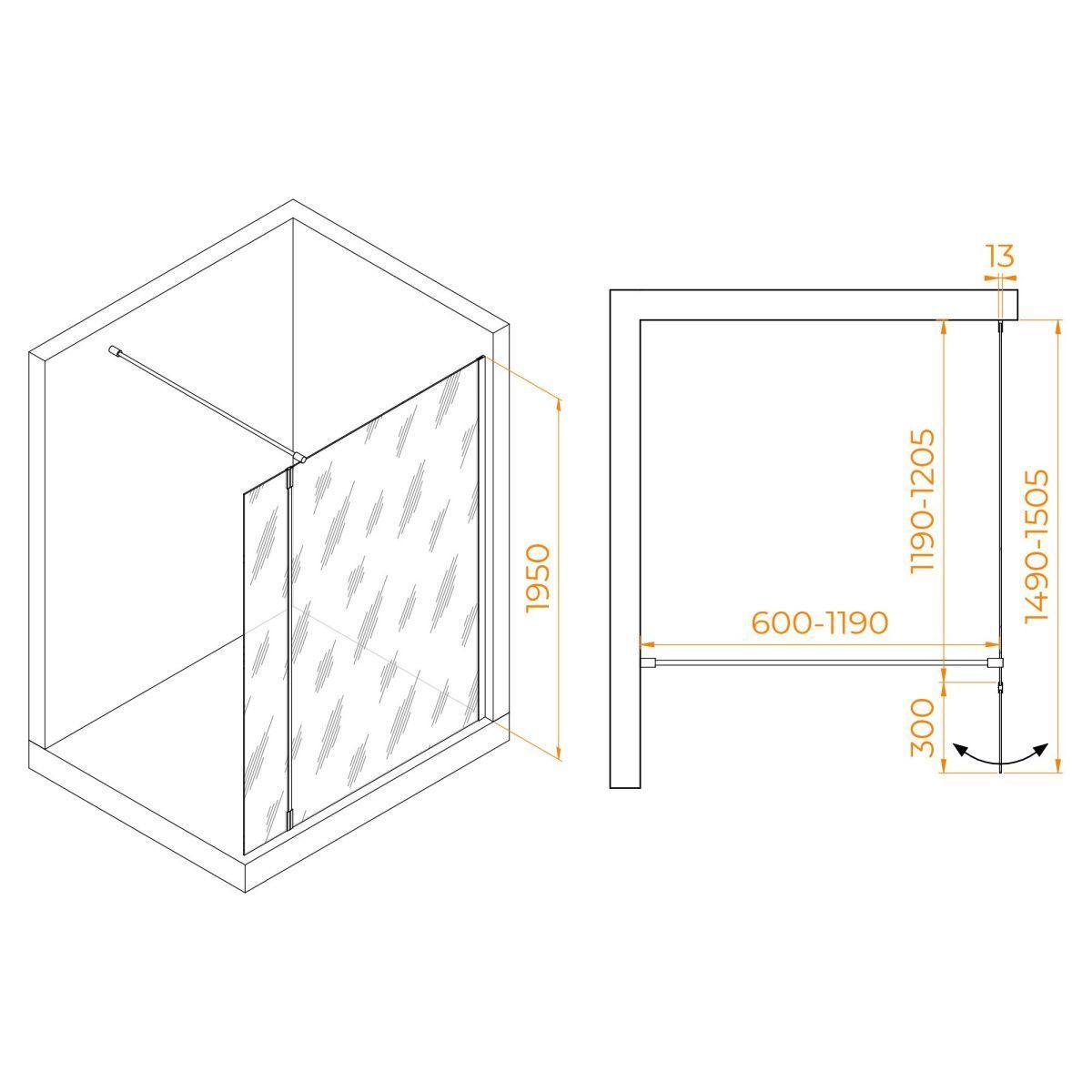 Душевая перегородка стационарная с поворотной маятниковой частью 300 мм