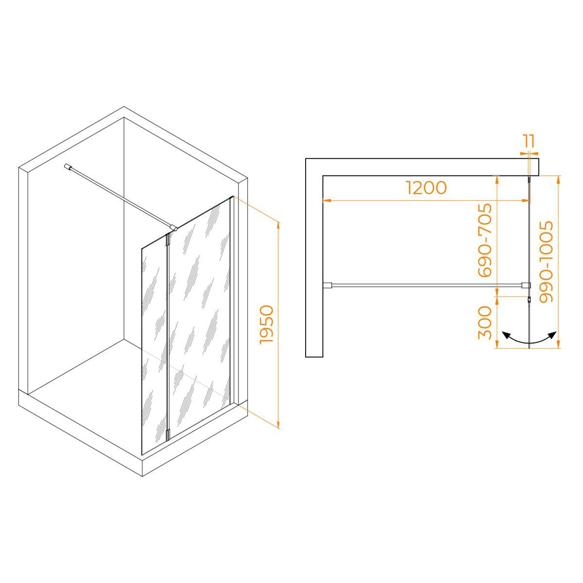 Душевая перегородка стационарная с поворотной маятниковой частью 300 мм