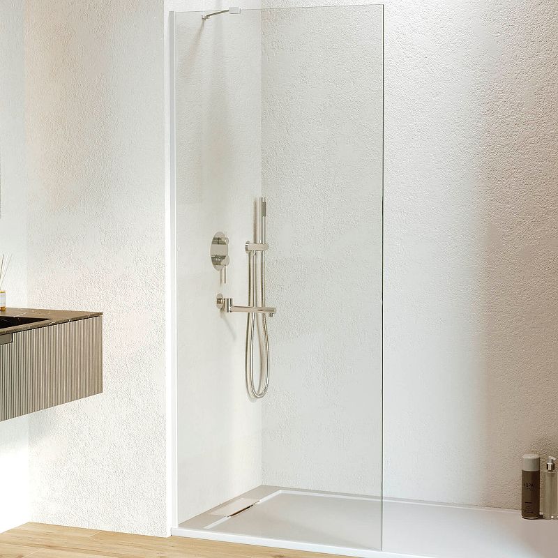 Толщина стекла данной перегородки составляет 8 мм, что делает ее очень прочной и надежной в использовании. Прозрачное стекло позволяет сохранить свет и пространство в ванной комнате, а белый цвет профиля придает ей элегантный и современный вид.