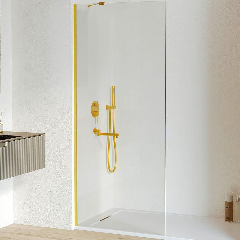 Толщина стекла данной перегородки составляет 8 мм, что делает ее очень прочной и надежной в использовании. Прозрачное стекло позволяет сохранить свет и пространство в ванной комнате, а цвет профиля золото браш придает ей элегантный и современный вид.
