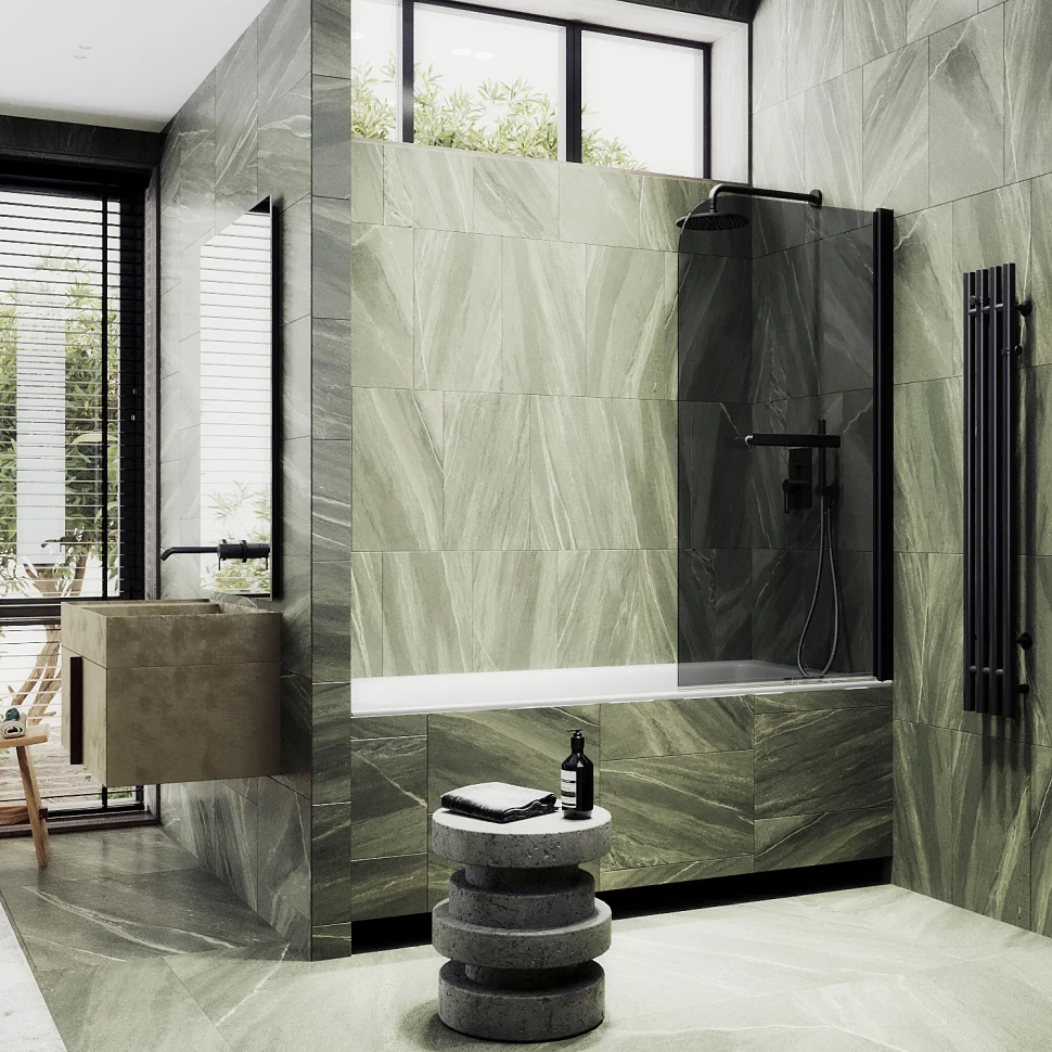 —Душевая шторка на ванну Maybah Glass MGV-785-6 70х140 стекло тонированное профиль черный ориентация универсальная