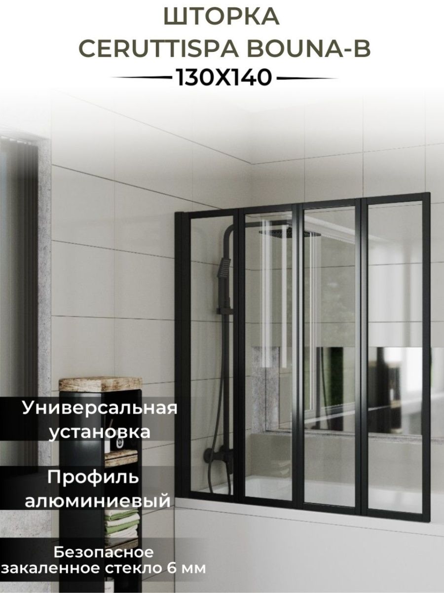 —Душевая шторка на ванну Cerutti SPA BOUNA-B 130х140 стекло прозрачное профиль черный ориентация универсальная