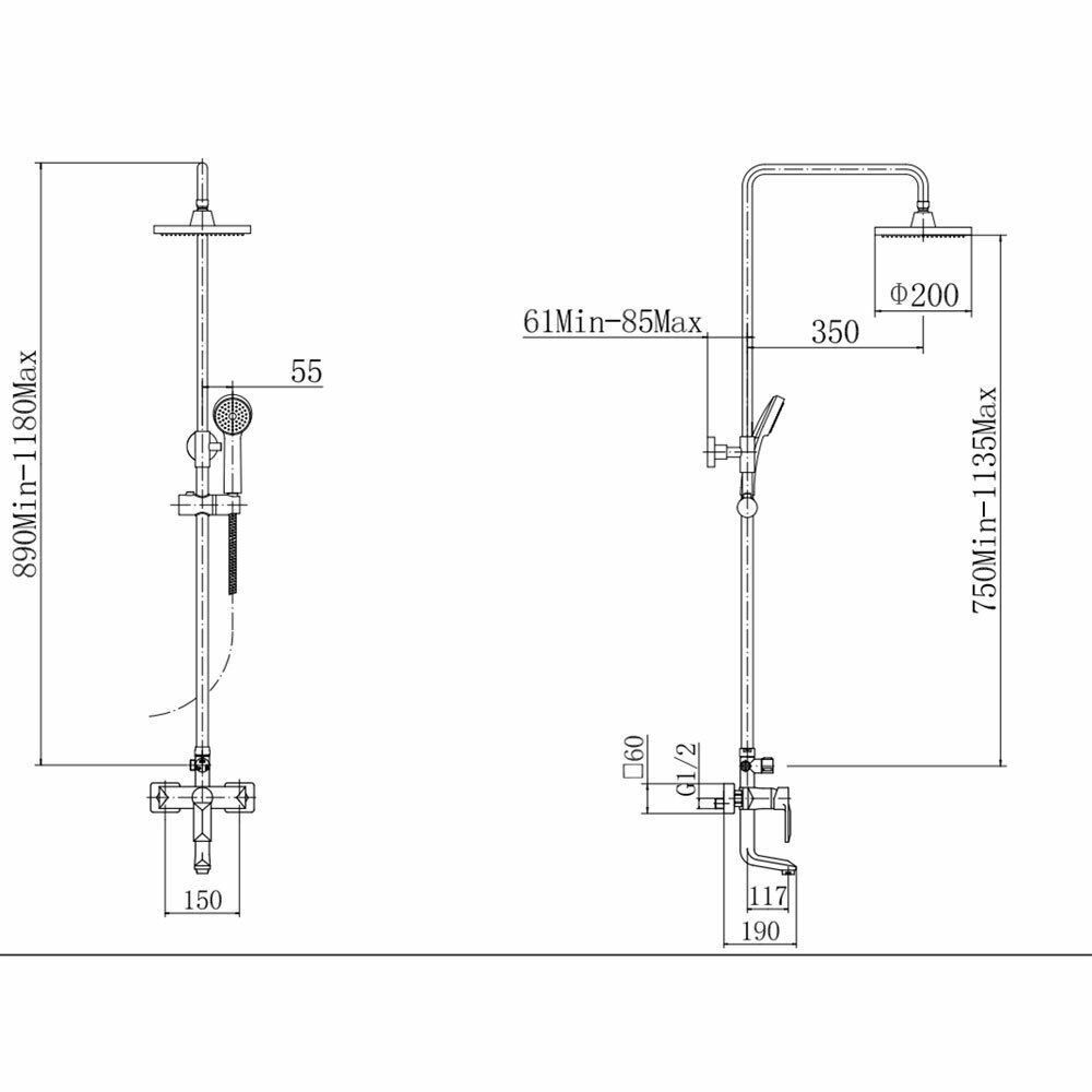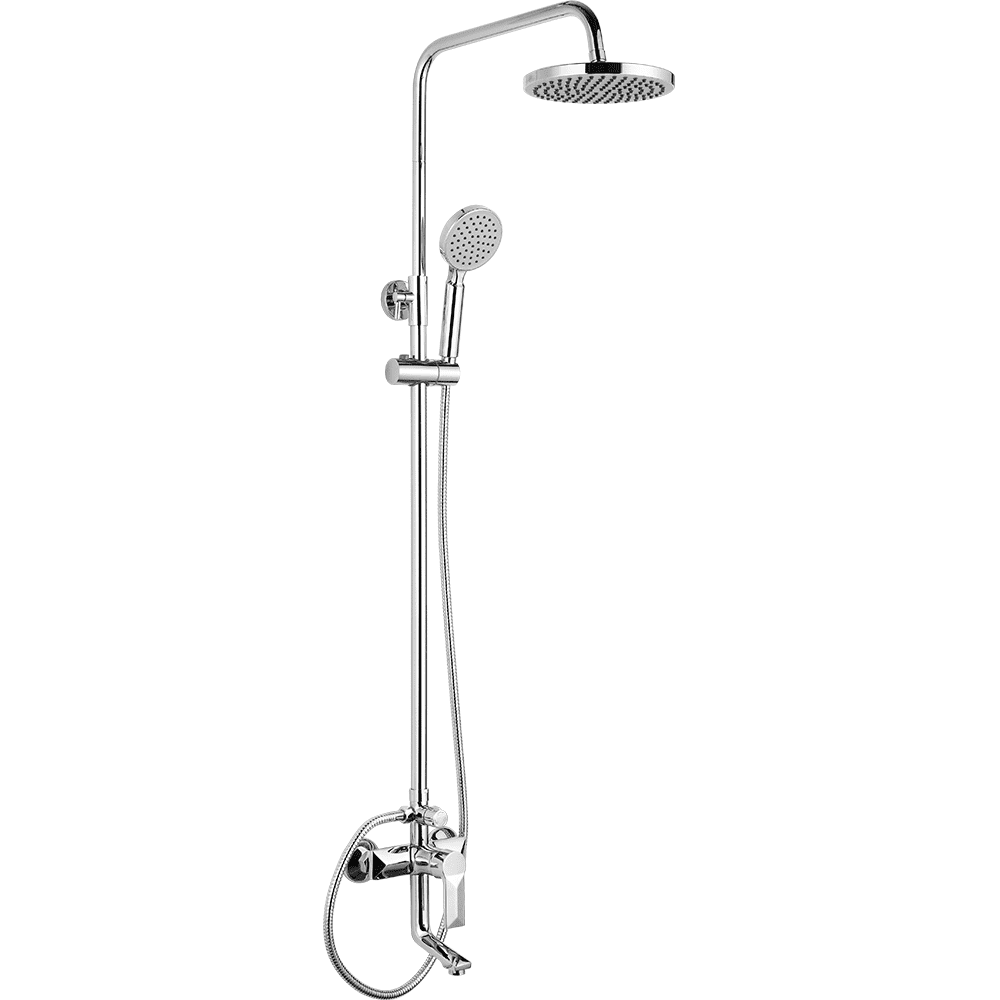A2418 душевая стойка хром смеситель: латунь, картридж D=35 мм излив: L=117 мм, поворотный дивертор: 3-х ходовой с керамическими пластинами установочный комплект + штанга: сталь SUS201, H=750-1135 мм верхняя лейка: ABS, D=200 мм ручная лейка: ABS, D=100 мм, 1 режим шланг: 1500 мм, оплётка сталь SUS201
