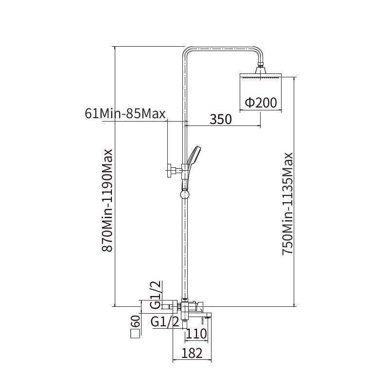A2446 душевая стойка хром смеситель: латунь, картридж D=35 мм излив: L=110 мм, поворотный, переключение потока дивертор: 2-х ходовой с керамическими пластинами установочный комплект + штанга: сталь SUS201, H=750-1135 мм верхняя лейка: ABS, D=200 мм ручная лейка: ABS, D=110 мм, 2 режима шланг: 1500 мм, оплётка сталь SUS201
