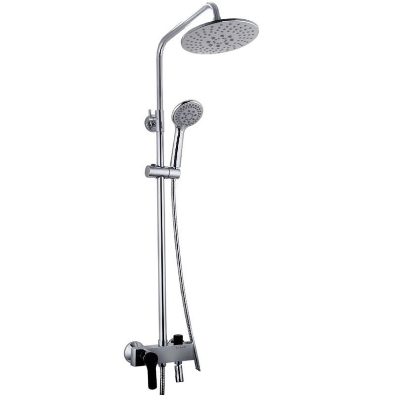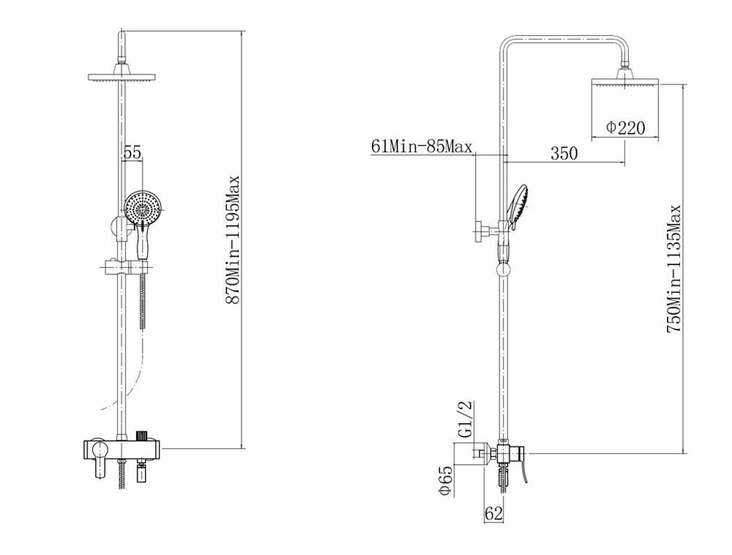 A2454 душевая стойка хром/чёрная смеситель с чёрной ручкой: латунь, картридж D=35 мм излив: поворотный 360° с аэратором дивертор: 3-х ходовой с керамическими пластинами, чёрный установочный комплект + штанга: сталь SUS201, H=750-1135 мм верхняя лейка: ABS, D=220 мм ручная лейка: ABS, D=100 мм, 3 режима шланг: 1500 мм, оплётка сталь SUS201