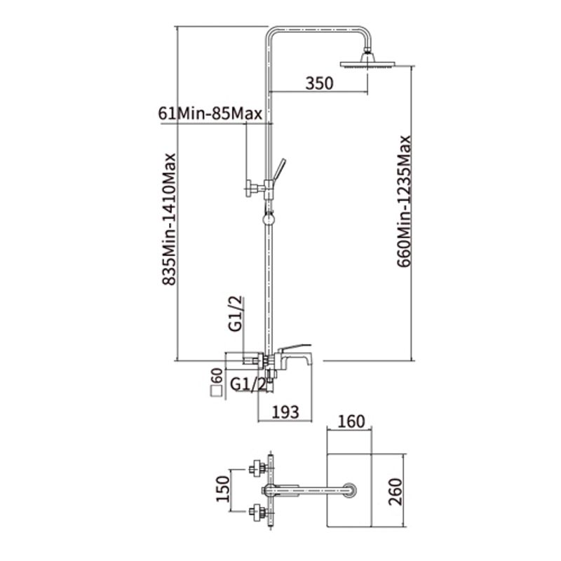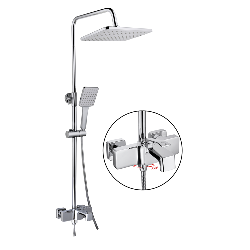 A2458 душевая стойка хром смеситель: латунь, картридж D=35 мм излив: L=145 мм, стационарный дивертор (внизу): 3-х ходовой с керамическими пластинами установочный комплект + штанга: сталь SUS201, H=660-1235 мм верхняя лейка: ABS, 260х160 мм ручная лейка: ABS,  115х85 мм, 1 режим шланг: 1500 мм, оплётка сталь SUS201