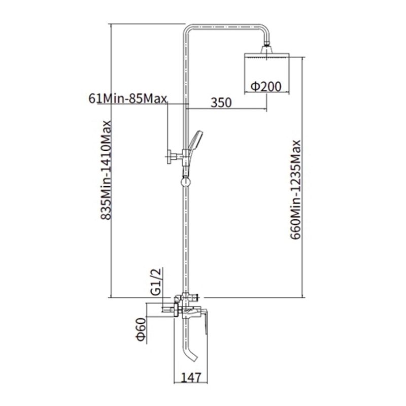 A2461 душевая стойка хром смеситель: латунь, картридж D=35 мм излив: стационарный дивертор: 3-х ходовой с керамическими пластинами установочный комплект + штанга: сталь SUS201, хром, H=660-1235 мм верхняя лейка: ABS, D=200 мм ручная лейка: ABS, D=100 мм, 3 режима шланг: 1500 мм, оплётка сталь SUS201