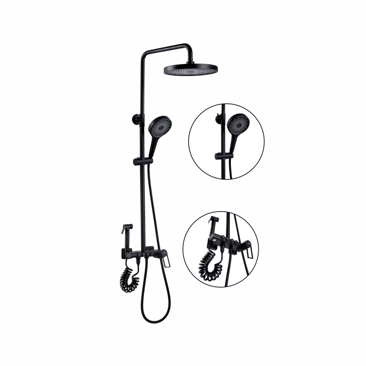 A2483-7 душевая стойка чёрная смеситель: латунь, картридж D=35 мм излив: встроенный в корпус аэратор дивертор: кнопочный 4-х ходовой установочный комплект + штанга: сталь SUS201, H=660-1100 мм, чёрная верхняя лейка: ABS, D=250 мм, чёрная с антикальком ручная лейка: ABS, D=130 мм, 2 режима, чёрная с антикальком шланг: 1500 мм, оплётка сталь SUS201, чёрный гигиеническая лейка: чёрная со спиральным шлангом