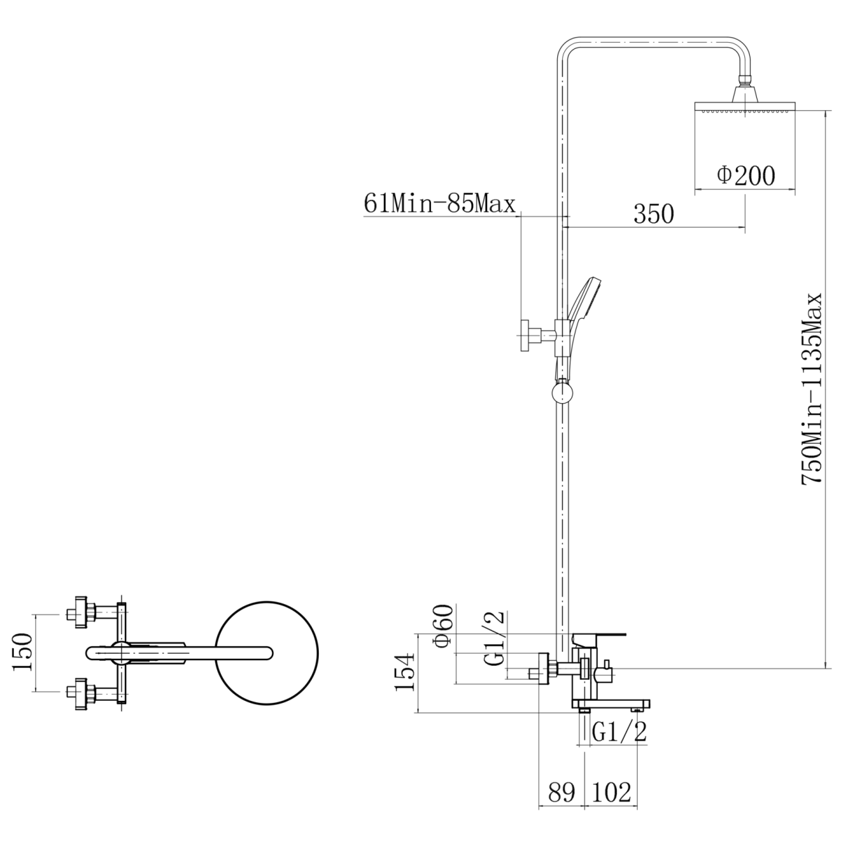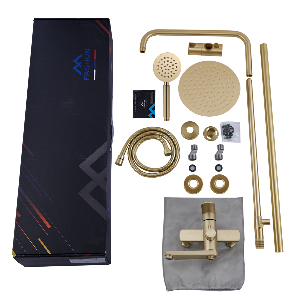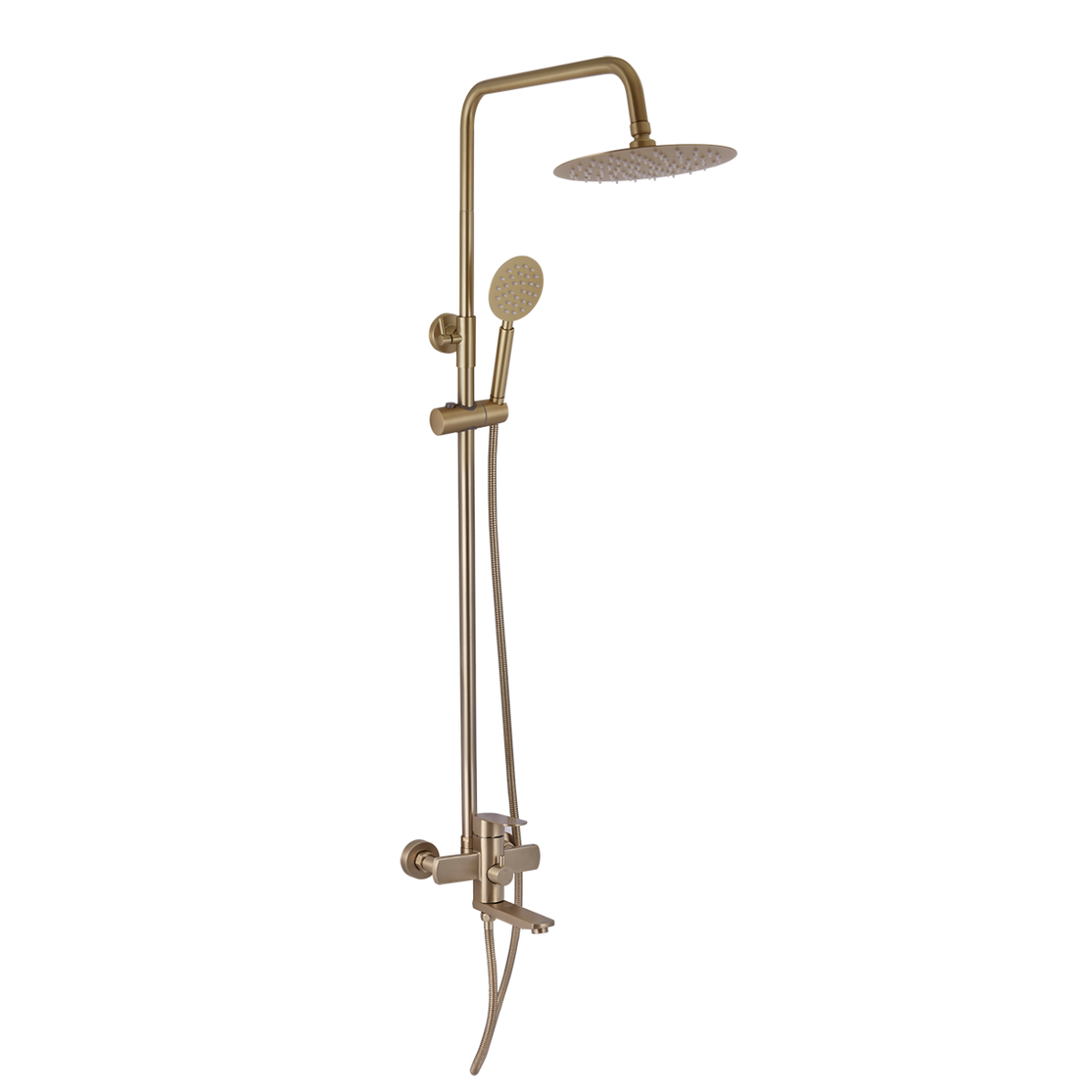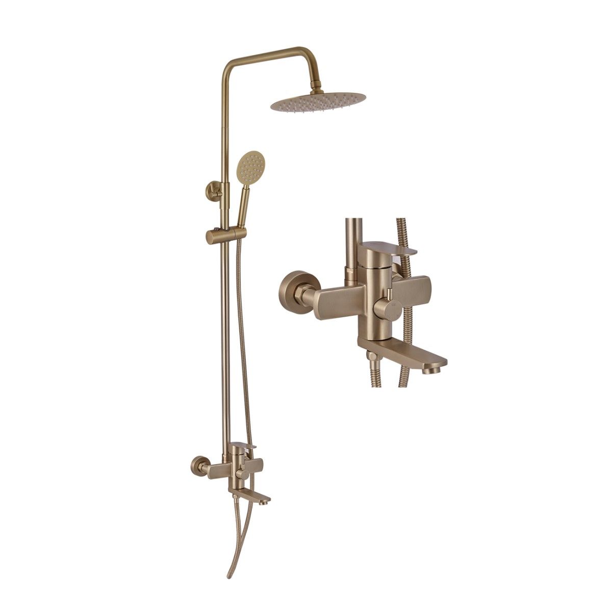A52401-21 душевая стойка бронза, PVD покрытие смеситель: сталь SUS304, картридж D=35 мм излив: L=102 мм, поворотный дивертор: 3-х ходовой с керамическими пластинами установочный комплект + штанга: сталь SUS201, H=750-1135 мм, бронза верхняя лейка: сталь SUS201, D=200 мм, антикальк, бронза ручная лейка: сталь SUS201, D=96 мм, антикальк, бронза шланг: A40-21, 1500 мм, оплётка сталь SUS201, бронза