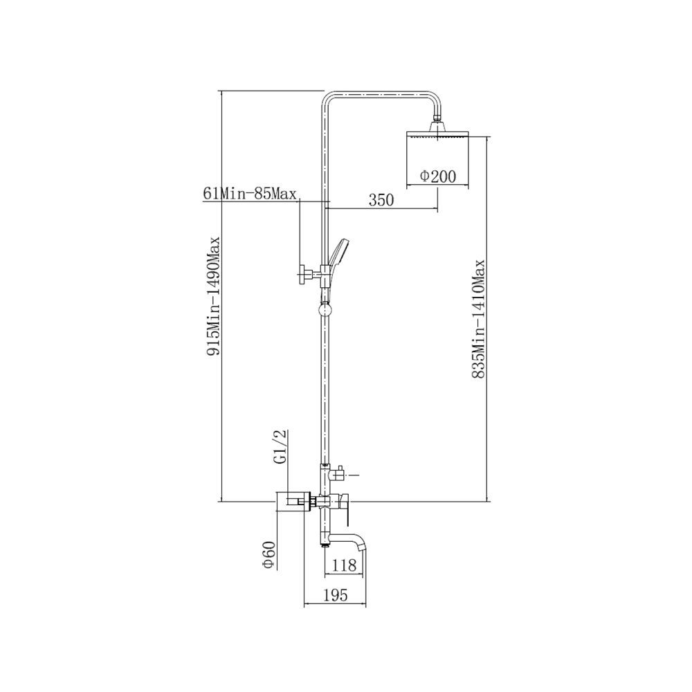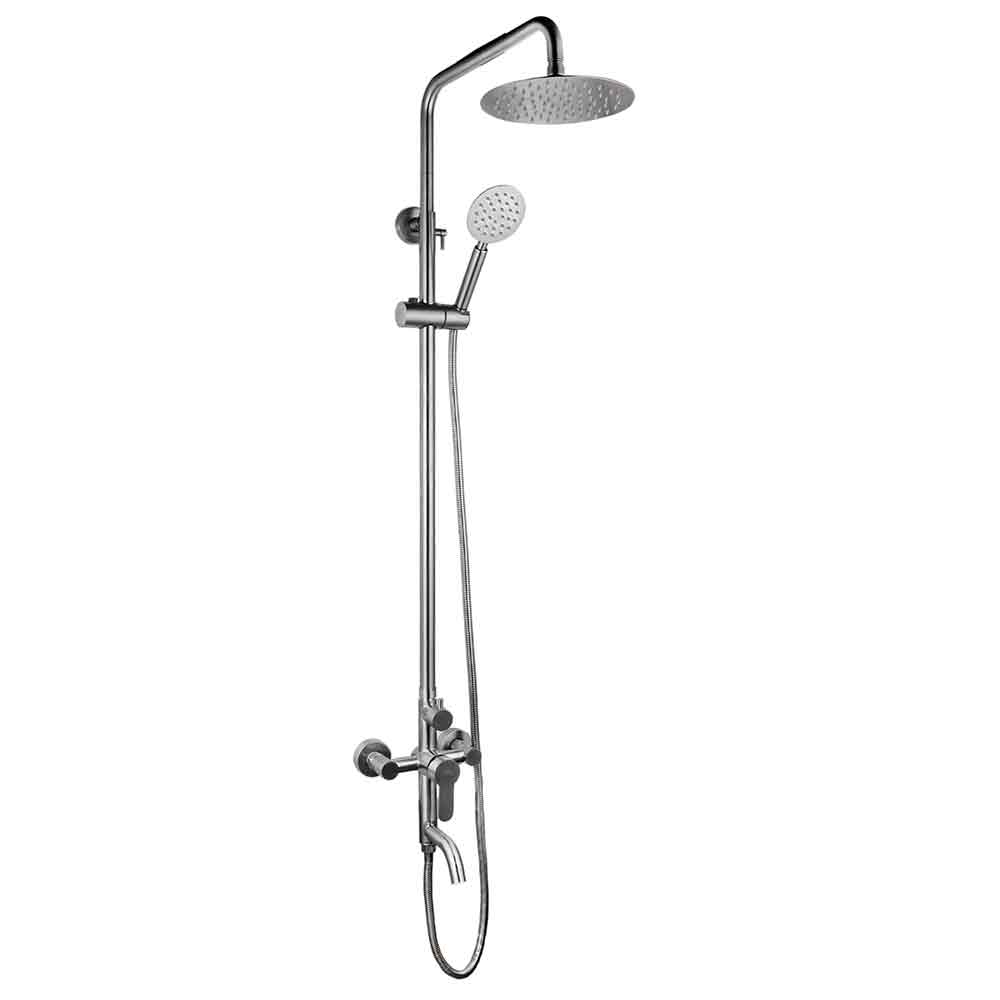A52401-3 душевая стойка сатин смеситель: сталь SUS304, картридж D=35 мм излив: L=118 мм, поворотный дивертор: 3-х ходовой с керамическими пластинами установочный комплект + штанга: сталь SUS304, сатин, H=835-1410 мм верхняя лейка: сталь SUS304, D=200 мм, антикальк ручная лейка: сталь SUS304, D=85 мм, антикальк шланг: 1500 мм, оплётка сталь SUS304