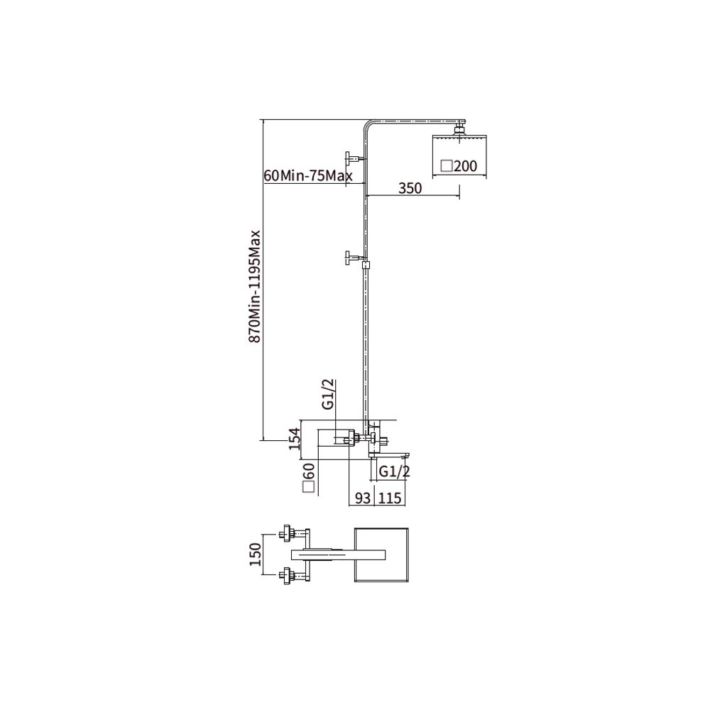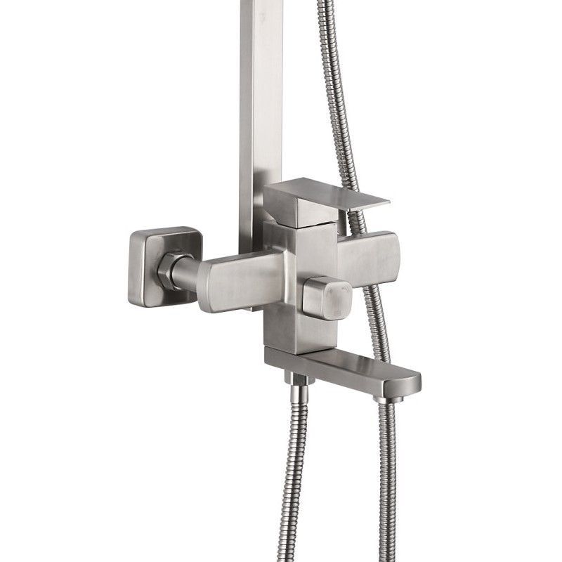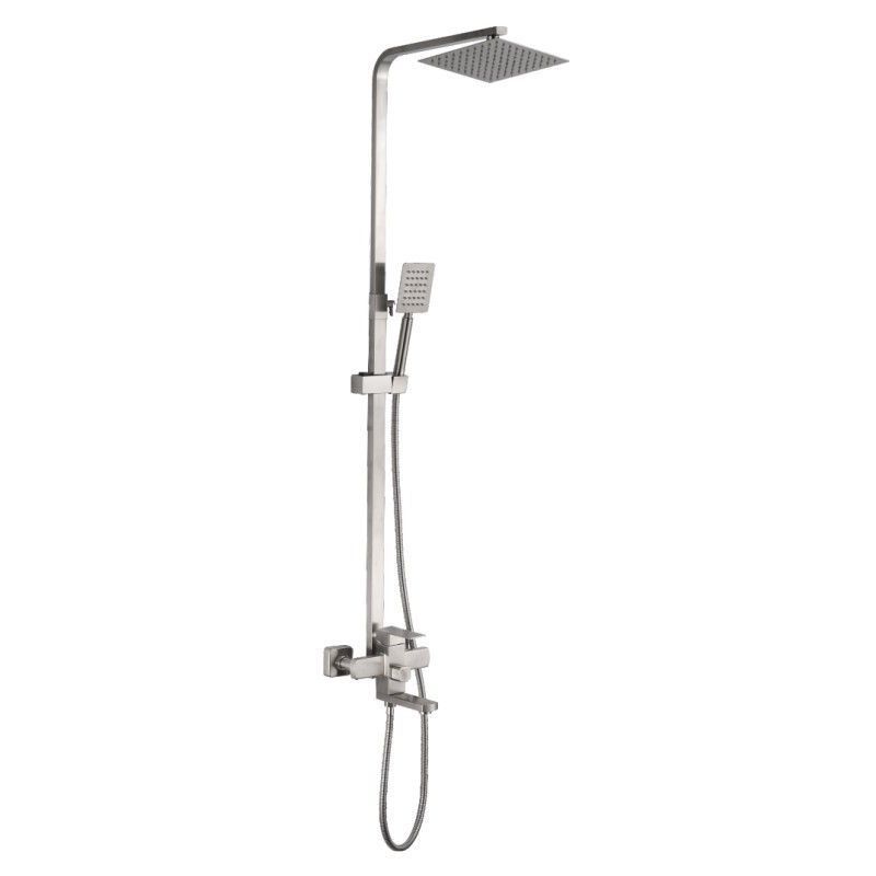 A52402 душевая стойка сатин смеситель: сталь SUS304, картридж D=35 мм излив: L=115 мм, поворотный дивертор: 3-х ходовой с керамическими пластинами установочный комплект + штанга: сталь SUS304, сатин, H=870-1195 мм верхняя лейка: сталь SUS304, квадратная 200х200 мм, антикальк ручная лейка: сталь SUS304, 100х80 мм, 1 режим, антикальк шланг: 1500 мм, сатин, оплётка сталь SUS304