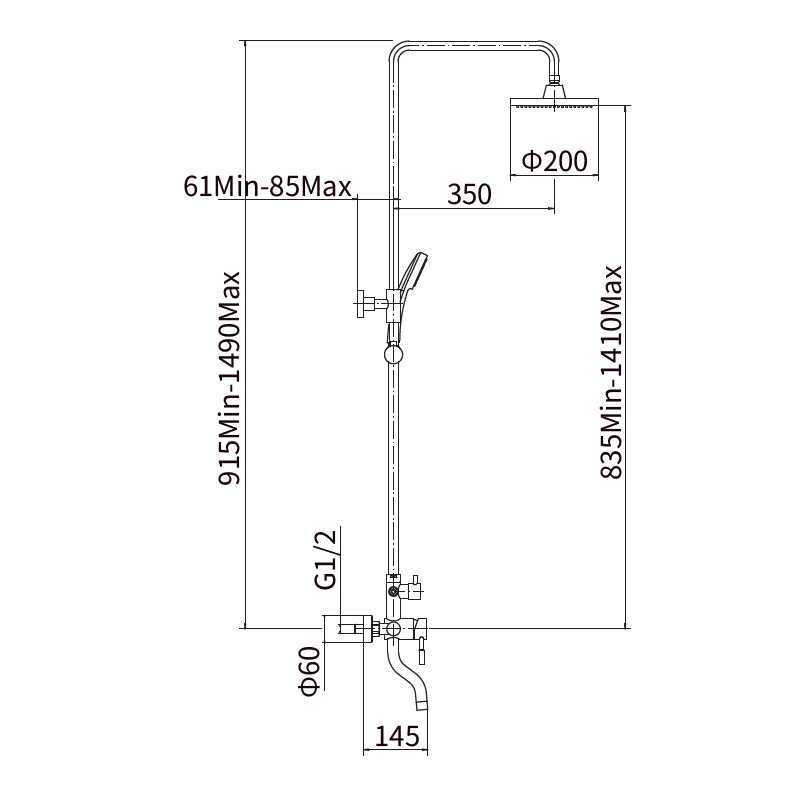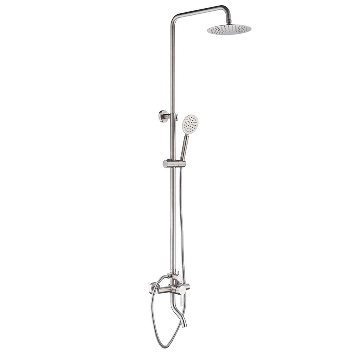 A52409 душевая стойка сатин смеситель: сталь SUS304, картридж D=35 мм излив: L=72,5 мм, стационарный дивертор: 3-х ходовой с керамическими пластинами установочный комплект + штанга: сталь SUS304, H=835-1410 мм верхняя лейка: сталь SUS304, D=200 мм, антикальк ручная лейка: сталь SUS304, D=85 мм, антикальк шланг: сатин, 1500 мм, оплётка сталь SUS304