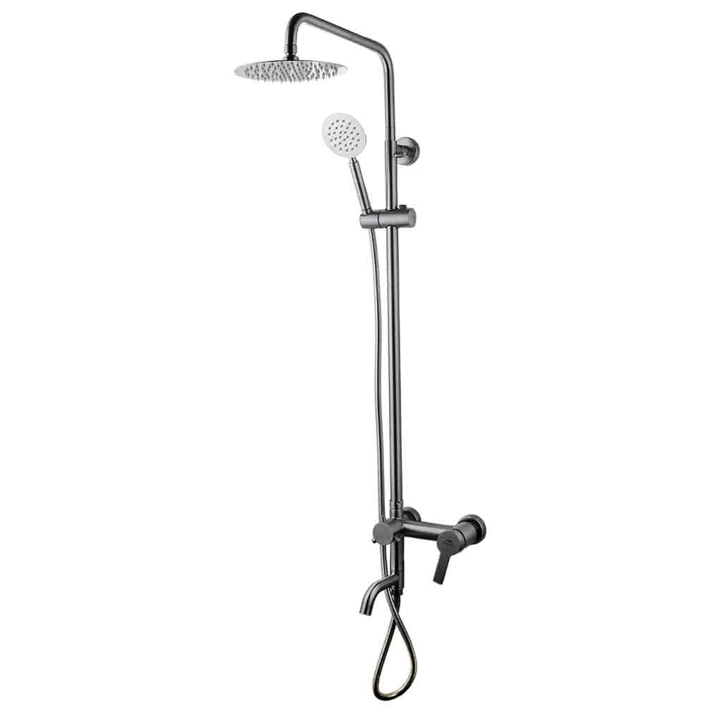 A52422 душевая стойка сатин смеситель: сталь SUS304, , картридж D=35 мм излив: L=118 мм, поворотный дивертор: 3-х ходовой с керамическими пластинами установочный комплект + штанга: сталь SUS304, H=830-1410 мм верхняя лейка: сталь SUS304, D=200 мм, антикальк ручная лейка: сталь SUS304, D=85 мм, антикальк шланг: 1500 мм, оплётка сталь SUS304