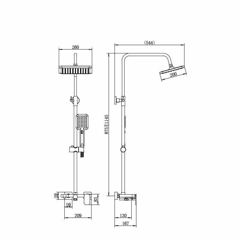 A52424-8 душевая стойка белая смеситель: сталь SUS304, картридж D=35 мм особенность: смеситель-полочка излив: L (от стены) = 130 мм, стационарный дивертор: 3-х ходовой с керамическими пластинами установочный комплект + штанга: белая, сталь SUS304, чёрная, H=750-1135 мм верхняя лейка: белая ABS, квадратная 200х200 мм ручная лейка: белая ABS, 115х85 мм, 2 режима шланг: белый, 1500 мм, оплётка сталь SUS304