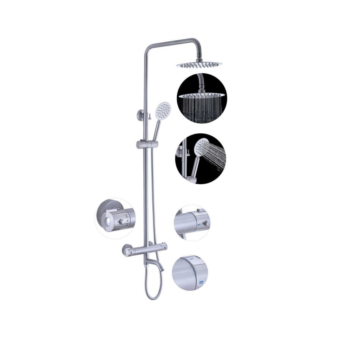 A52426 душевая стойка с термостатическим смесителем для ванны сатин смеситель-термостат: сталь SUS304 излив: L=163 мм, поворотный, переключение потока дивертор: поворот излива + ручка справа установочный комплект + штанга: сталь SUS304, H=780-1360 мм (от верхнего излива), сатин верхняя лейка: сталь SUS304, D=200 мм, сатин ручная лейка: сталь SUS304, D=96 мм, сатин шланг: 1500 мм, оплётка сталь SUS304, сатин