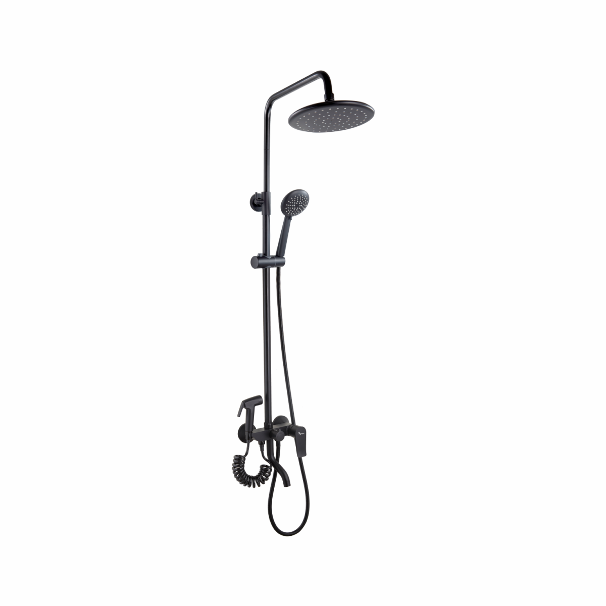 PL2403-7 душевая стойка чёрная смеситель: ABS пластик, картридж D=35 мм внутр. часть соприкасающаяся с водой: ABS пластик излив: ABS, поворотный с аэратором дивертор: 4-х ходовой с керамическими пластинами установочный комплект + штанга: сталь SUS201, H=810-1230 мм, чёрная верхняя лейка: ABS, D=200 мм ручная лейка: ABS,  D=80 мм, 3 режима шланг: 1500 мм, оплётка сталь SUS304, чёрный гигиен. лейка: ABS со спиральн. шлангом, L=1200 мм, чёрная