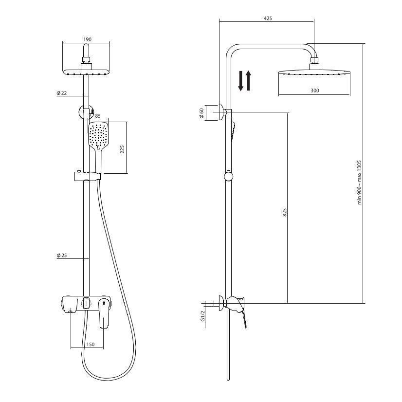 Вылет верхнего душа, см