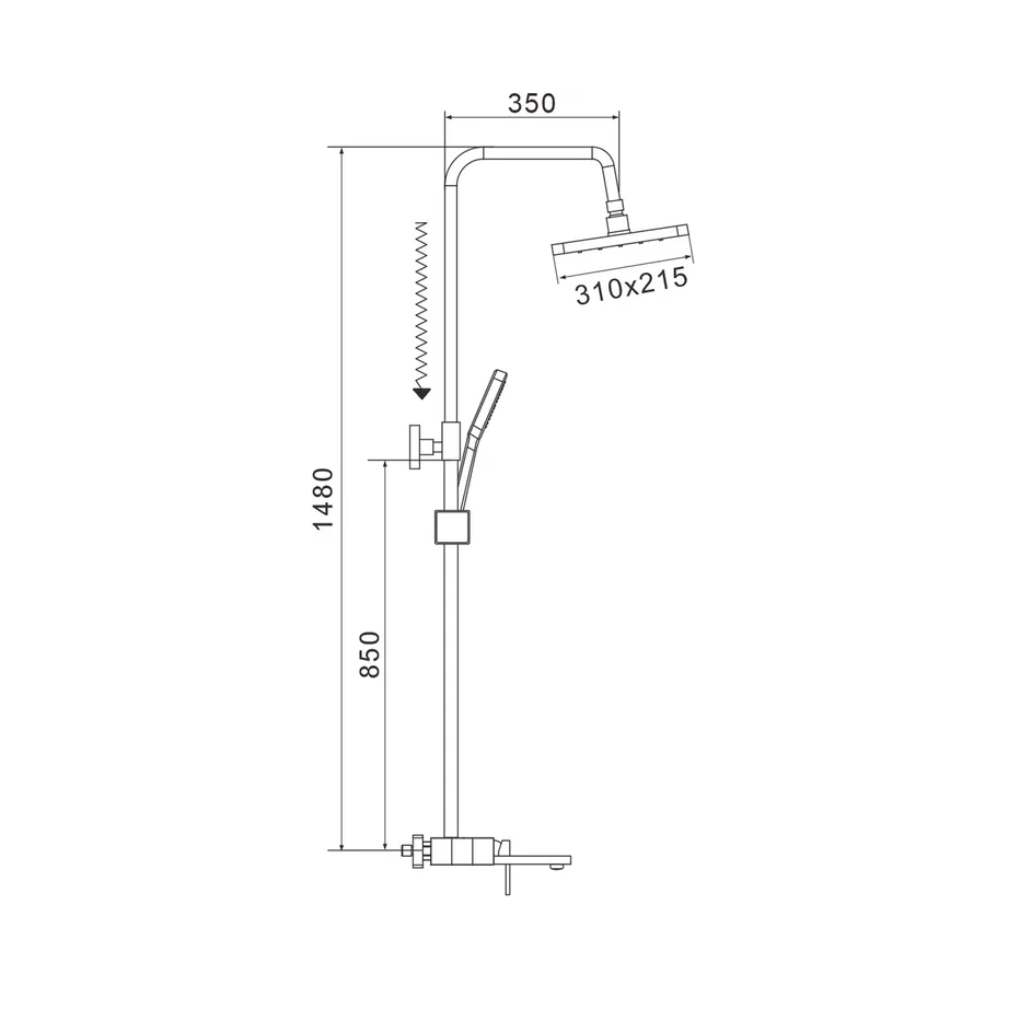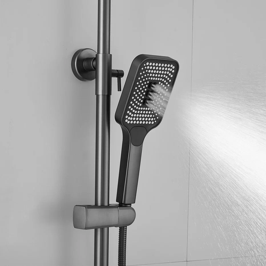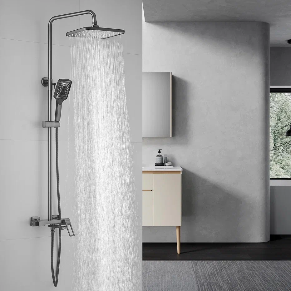Душевая система Shevanik S6836T, оружейная сталь. Количество режимов струи: 3. Размер верхнего душа: 31x21,5 см. Управление: рычажное. Излив для наполнения ванны: да.