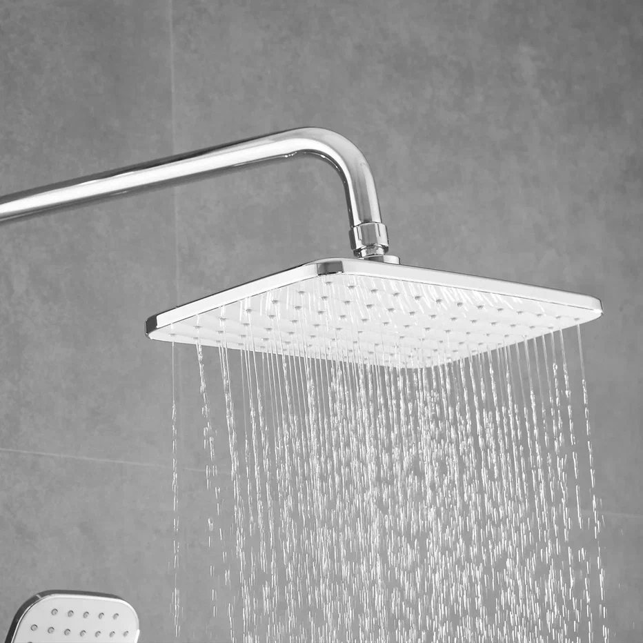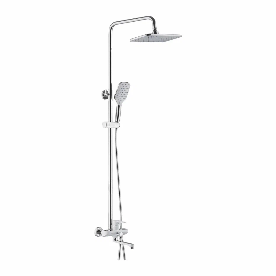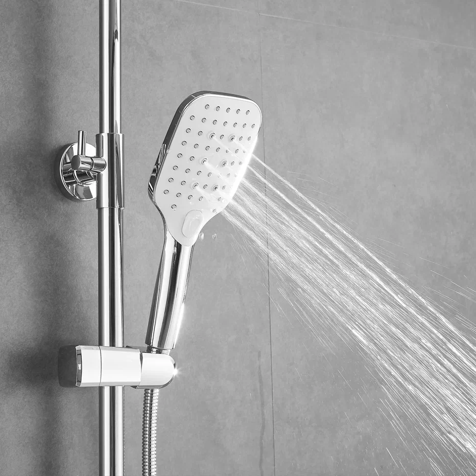 Душевая система Shevanik S8136F, белый/хром. Количество режимов струи: 3. Размер верхнего душа: 29,5x18 см. Управление: рычажное. Излив для наполнения ванны: да.