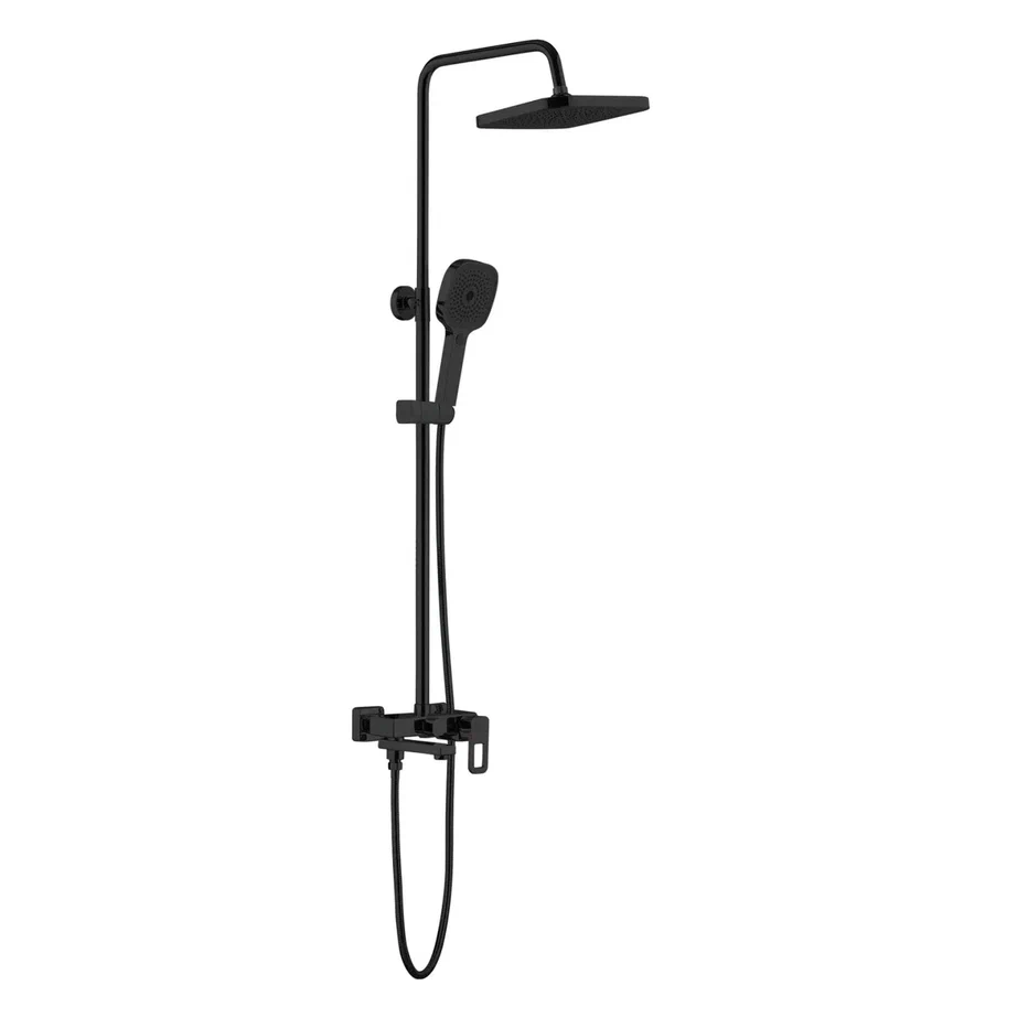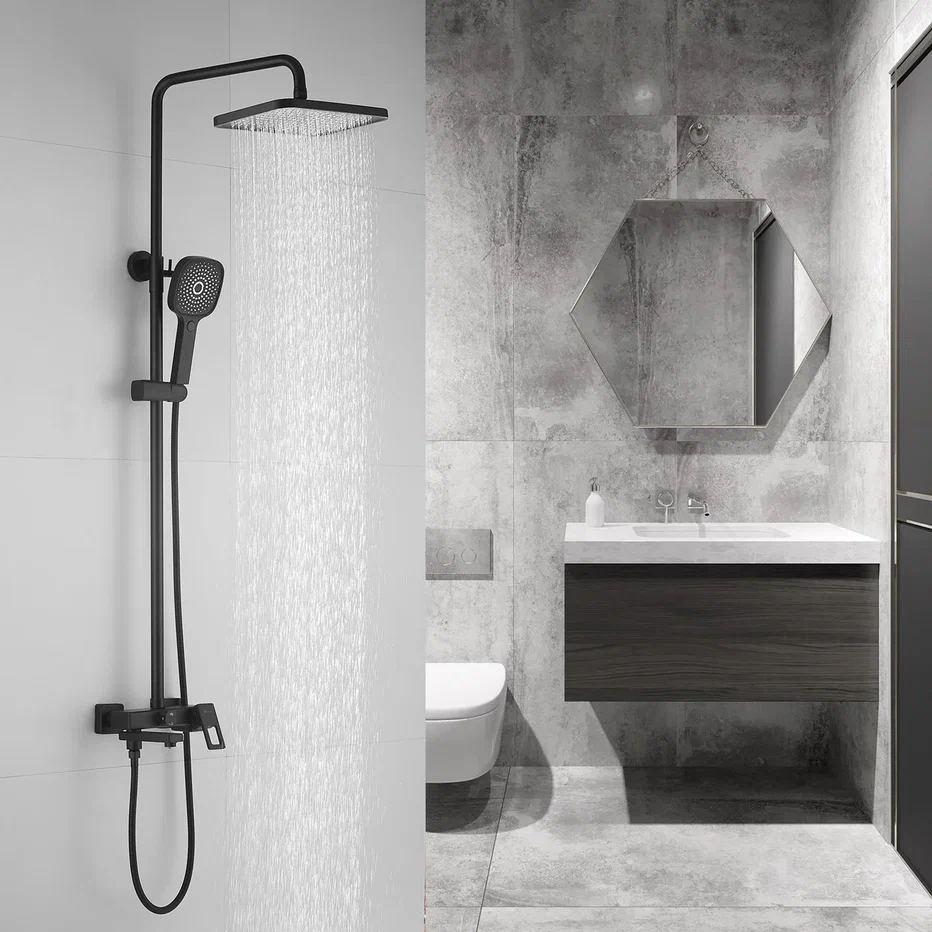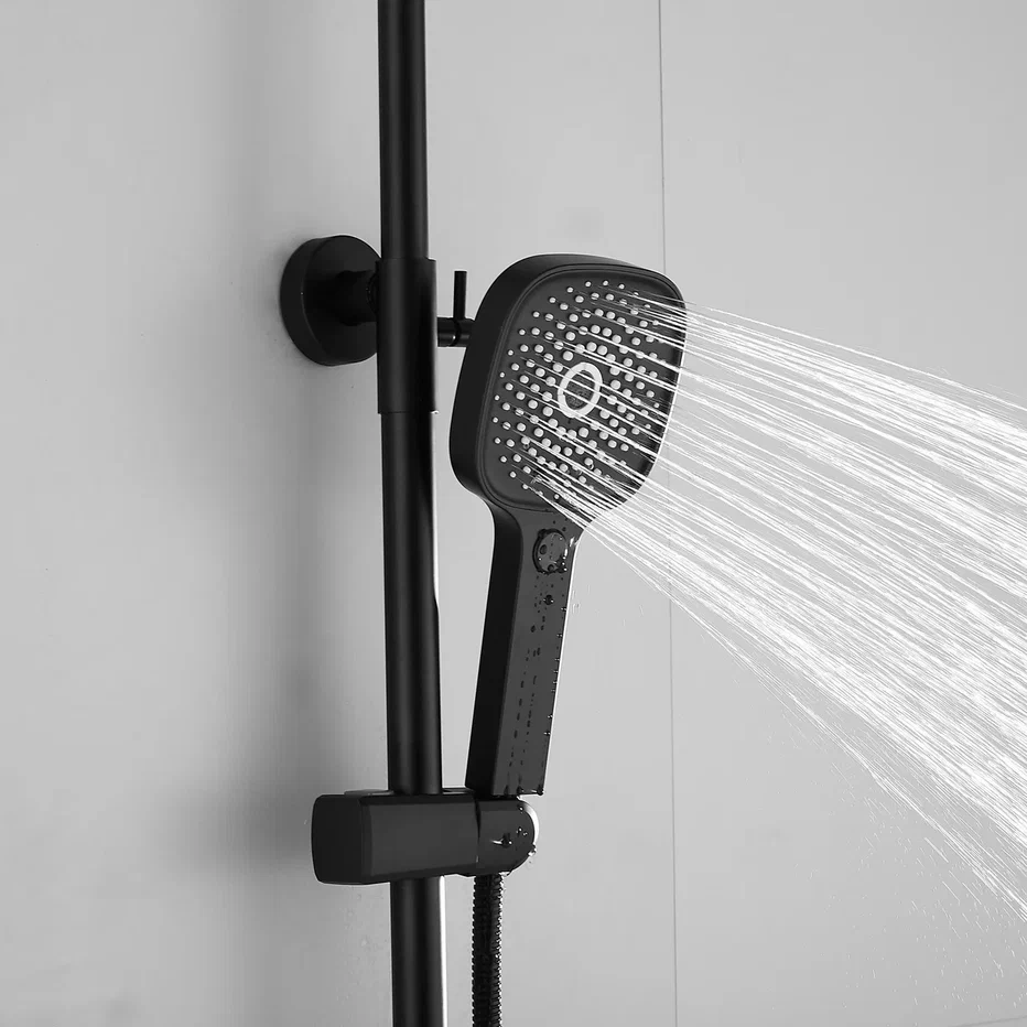 Душевая система Shevanik S8236H, черный. Количество режимов струи: 3. Размер верхнего душа: 29,5x19 см. Управление: рычажное. Излив для наполнения ванны: да.