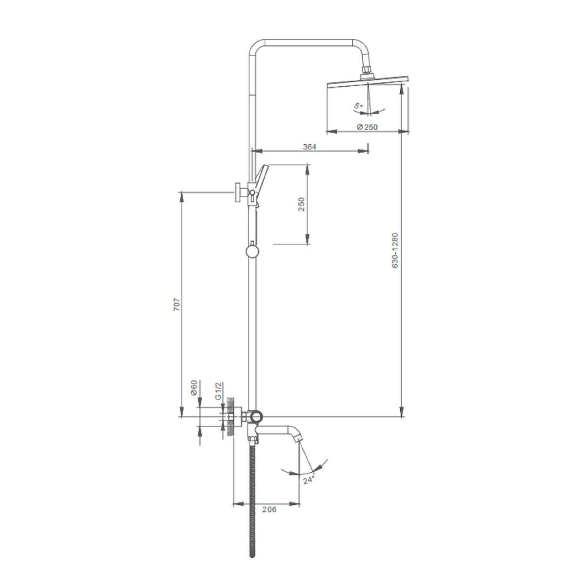 Душевая система Splenka S03.24.06. Цвет: черный. Материал: латунь. Управление: однорычажное. Механизм: керамический картридж. Излив: поворотный. Аэратор. Стандарт подводки: G 1/2. Форма верхнего душа: круглая. Диаметр верхнего душа: 250 мм. Количество режимов струи ручного душа: 3. Регулируемая душевая штанга: 630-1280 мм. Монтаж: на стену. Керамический картридж 30мм - S500.30. Переключатель с керамическими пластинами (угол поворота – 90°) - R505.01. Переключатель в изливе - S501.527. Излив - функция переключения. Аэратор - S540.722.06. Душевой шланг 1.5м - 403.15.06.