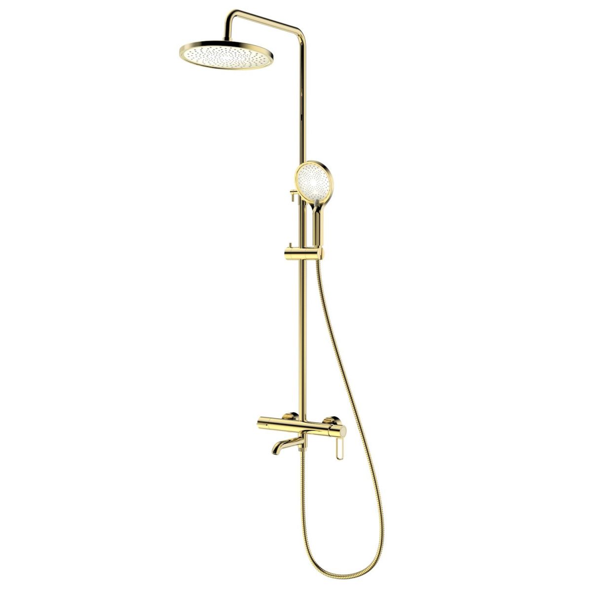 Душевая система Splenka S03.24.23. Цвет: золото. Материал: латунь. Управление: однорычажное. Механизм: керамический картридж. Излив: поворотный. Аэратор. Стандарт подводки: G 1/2. Форма верхнего душа: круглая. Диаметр верхнего душа: 250 мм. Количество режимов струи ручного душа: 3. Регулируемая душевая штанга: 630-1280 мм. Монтаж: на стену. Керамический картридж 30мм - S500.30. Переключатель с керамическими пластинами (угол поворота – 90°) - R505.01. Переключатель в изливе - S501.527. Излив - функция переключения. Аэратор - S540.722.23 Душевой шланг 1.5м - 402.15.23.