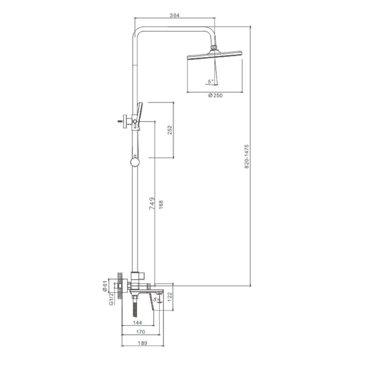 Душевая система Splenka S04.24. Цвет: хром. Материал: латунь. Управление: однорычажное. Механизм: керамический картридж. Излив: поворотный. Аэратор. Стандарт подводки: G 1/2. Форма верхнего душа: круглая. Диаметр верхнего душа: 250 мм. Количество режимов струи ручного душа: 3. Регулируемая душевая штанга: 820-1475 мм. Монтаж: на стену. Керамический картридж 35мм - S500.35. Переключатель с керамическими пластинами (угол поворота – 90°) - S501.529. Переключатель в изливе - S501.527. Излив - функция переключения. Аэратор - S540.721. Душевой шланг 1.5м - S402.15.