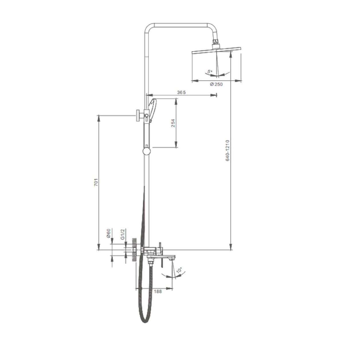 Душевая система Splenka S05.24. Цвет: хром. Материал: латунь. Управление: однорычажное. Механизм: керамический картридж. Излив: поворотный. Аэратор. Стандарт подводки: G 1/2. Форма верхнего душа: круглая. Диаметр верхнего душа: 250 мм. Количество режимов струи ручного душа: 3. Регулируемая душевая штанга: 640-1210 мм. Монтаж: на стену. Керамический картридж 35мм - S500.35. Переключатель с керамическими пластинами (угол поворота – 90°) - S501.528. Переключатель в изливе - S501.527. Излив - функция переключения. Аэратор - S540.721. Душевой шланг 1.5м - S402.15.