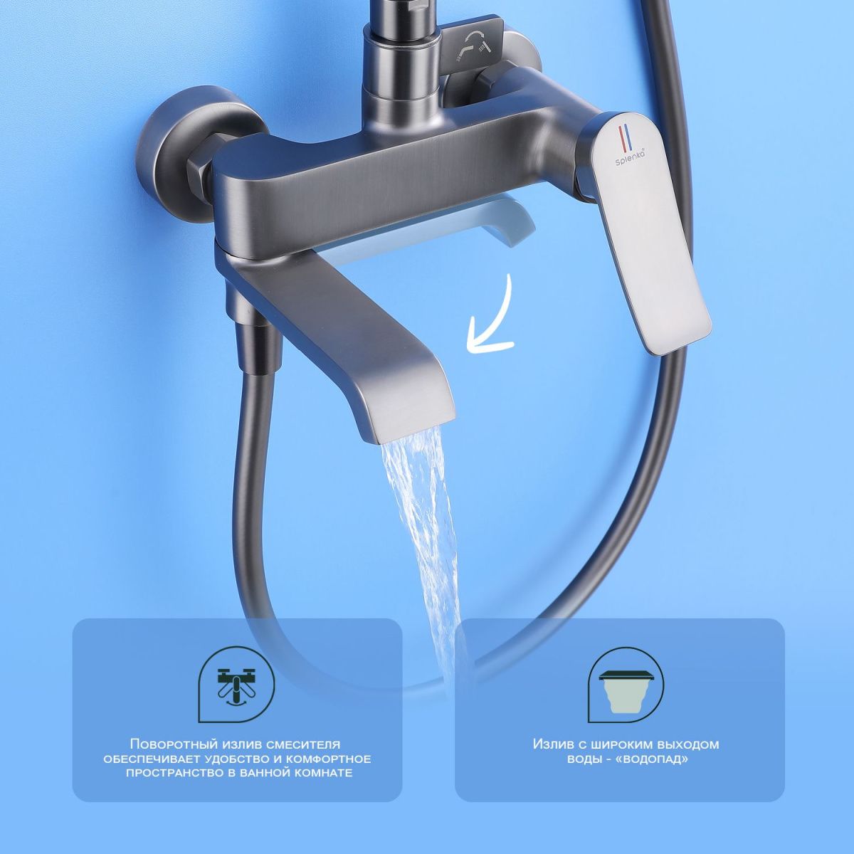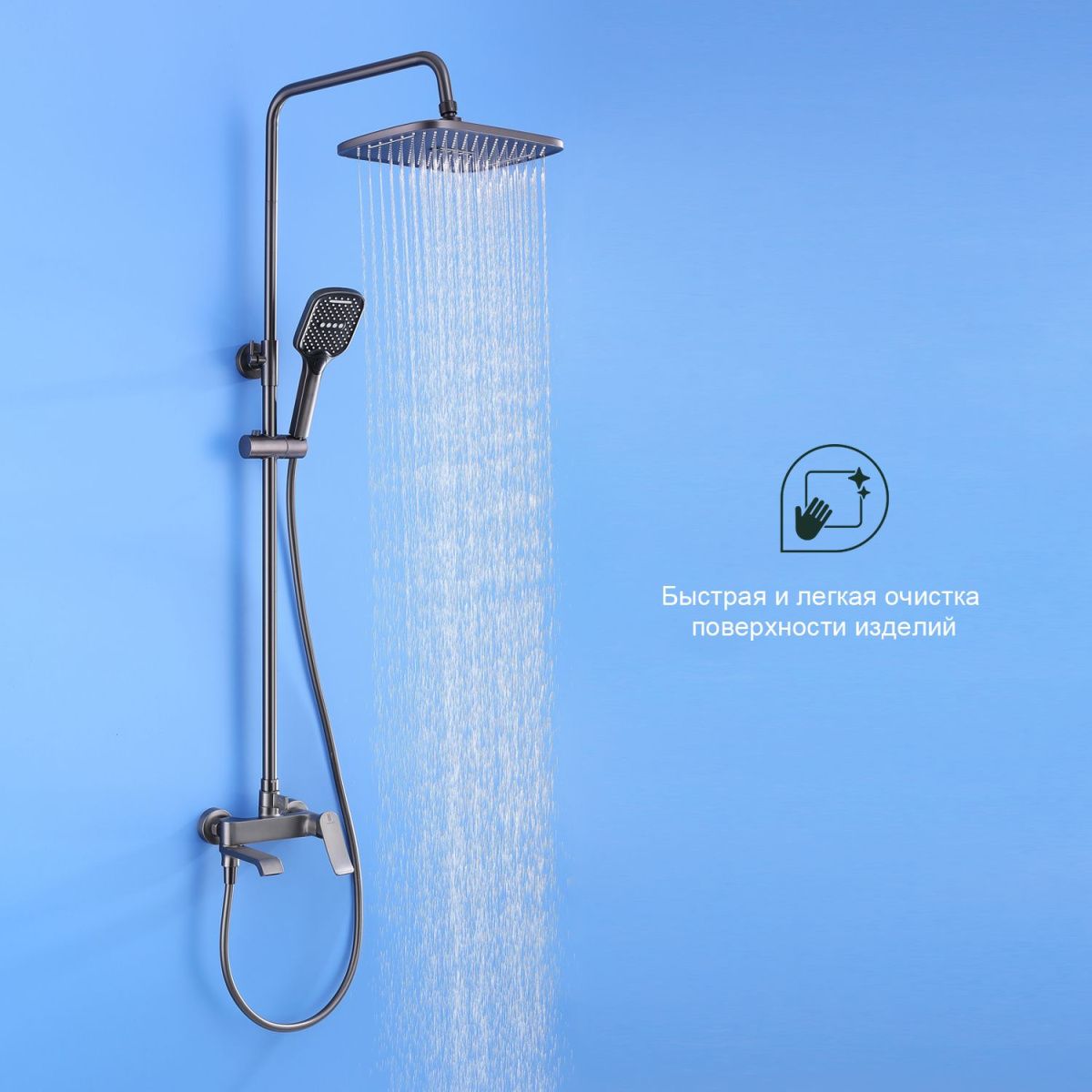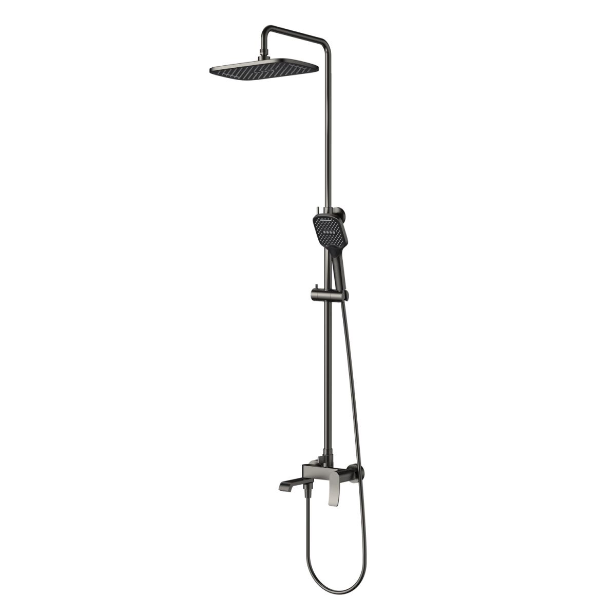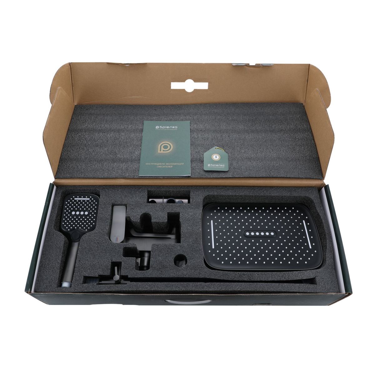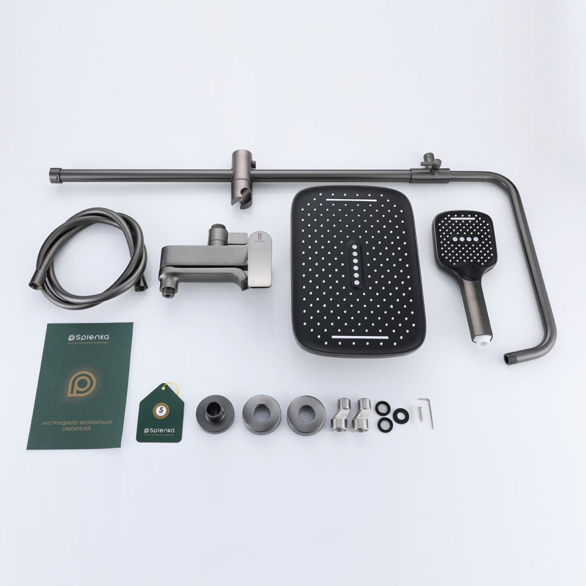 Душевая система Splenka S31.24.09. Цвет: графит. Материал: латунь. Управление: однорычажное. Механизм: керамический картридж. Излив: поворотный. Тип излива: каскадный. Аэратор. Стандарт подводки: G 1/2. Форма верхнего душа: прямоугольная. Размер верхнего душа (ШхД): 320х210 мм. Количество режимов струи ручного душа: 3. Переключение режимов ручного душа: кнопочное. Регулируемая душевая штанга. Регулируемый по высоте держатель ручного душа. Монтаж: на стену. Излив - функция переключения. Керамический картридж 30мм - S500.30. Переключатель с керамическими пластинами (угол поворота – 180°) - S501.528. Переключатель в изливе - S501.527. Аэратор - S540.733.09.   Душевой шланг 1.5м - S403.15.09.