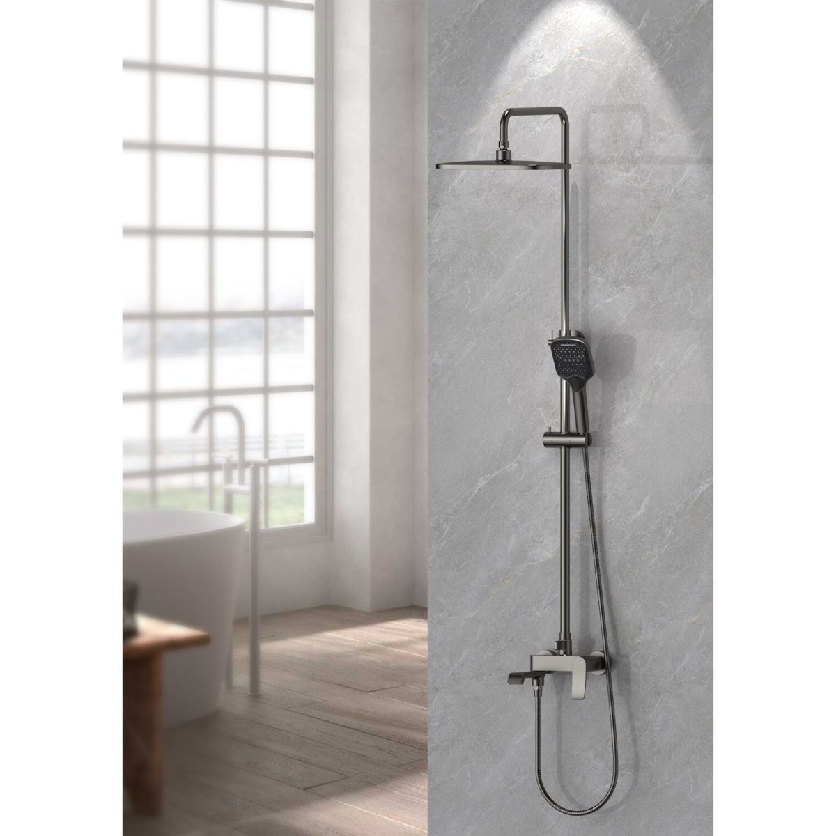 верхний душ, душевая штанга с держателем лейки, ручной душ, смеситель, шланг