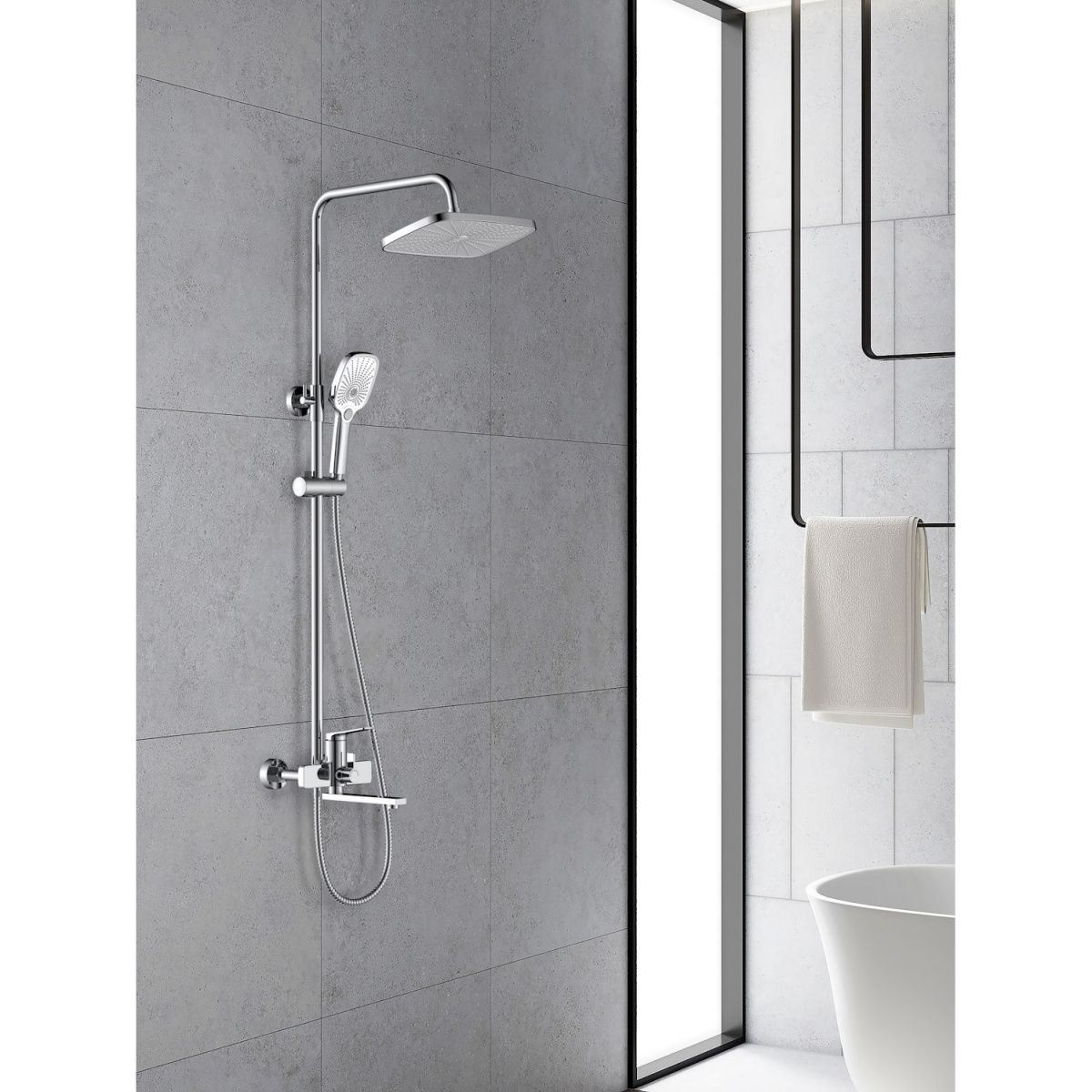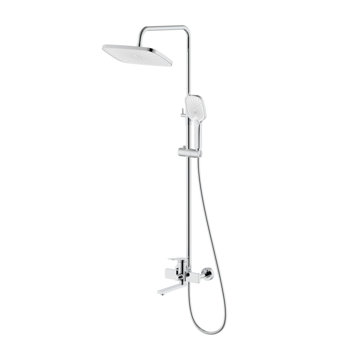 верхний душ, душевая штанга с держателем лейки, ручной душ, смеситель, шланг
