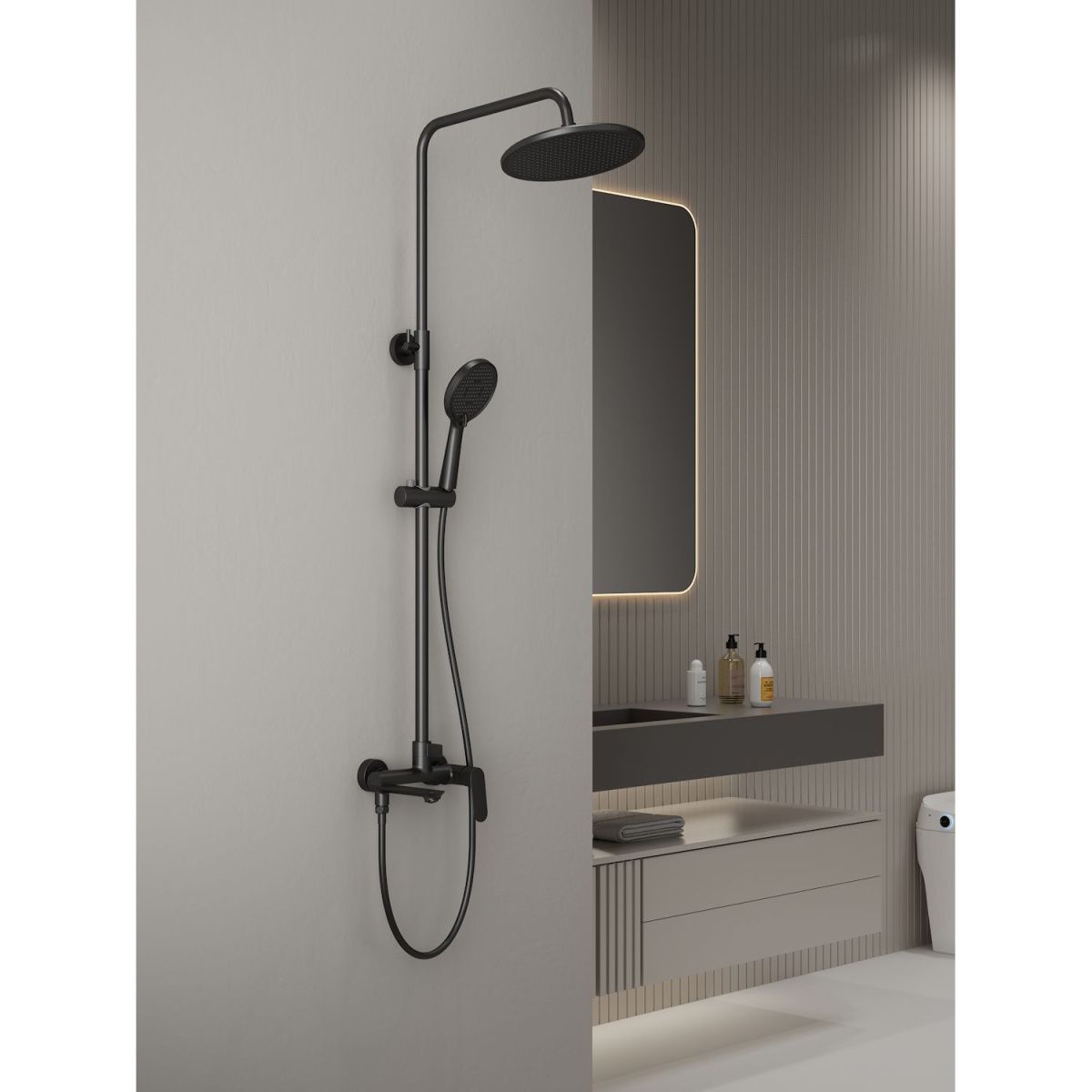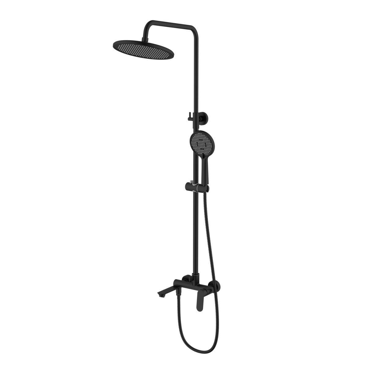Душевая система Splenka S41.24.06. Цвет: черный. Материал: латунь. Управление: однорычажное. Механизм: керамический картридж. Излив: поворотный. Аэратор. Стандарт подводки: G 1/2. Форма верхнего душа: круглая. Диаметр верхнего душа: 250 мм. Количество режимов струи ручного душа: 3. Переключение режимов ручного душа: флажковое. Регулируемая по высоте душевая штанга: 950-1350 мм. Регулируемый по высоте держатель ручного душа. Монтаж: на стену. Излив - функция переключения. Керамический картридж 30мм - S500.30. Переключатель с керамическими пластинами (угол поворота – 180°) - S501.528. Переключатель в изливе - S501.527. Аэратор - S540.721.06. Душевой шланг 1.5м - S403.15.06.