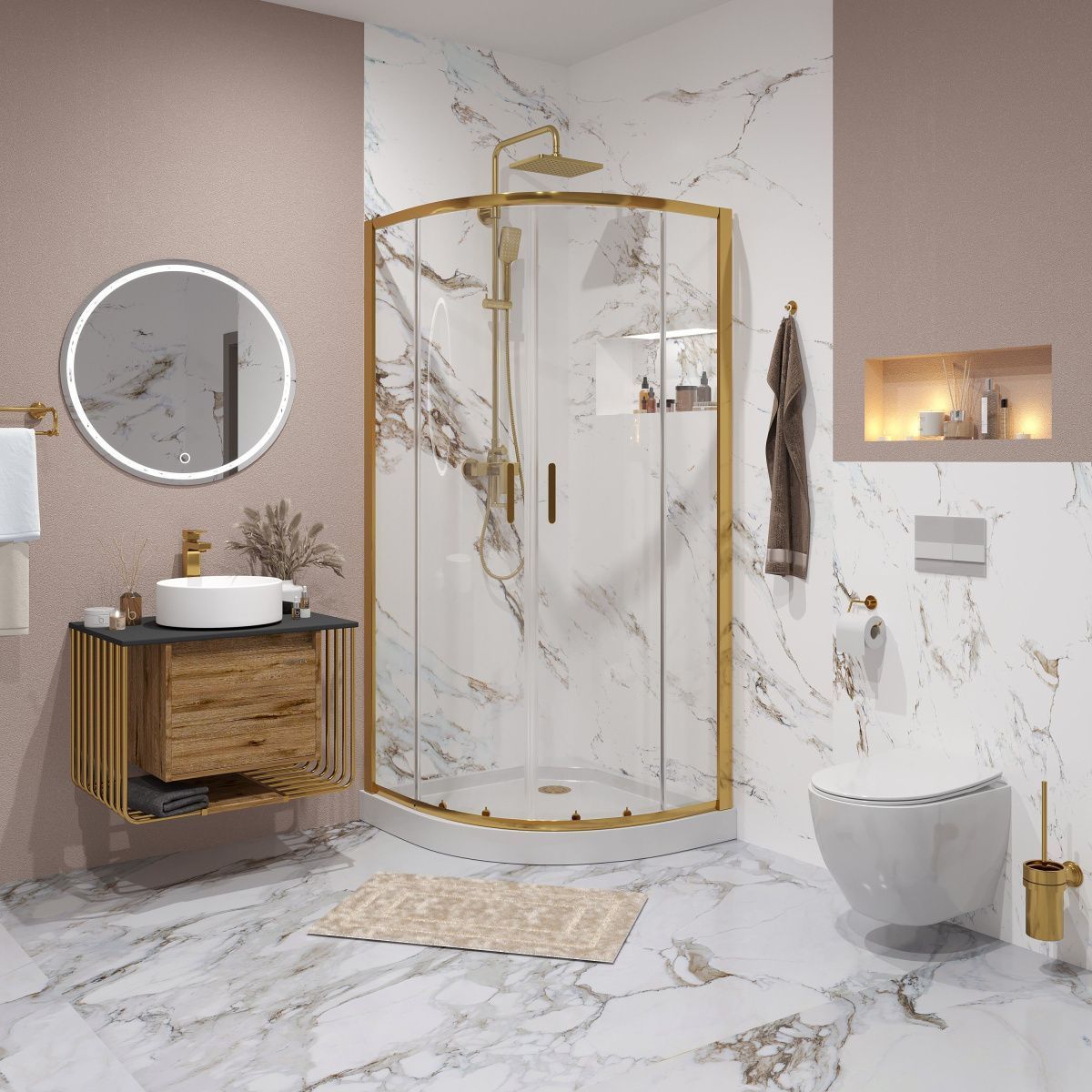Душевое ограждение выполнено из анодированного аллюминия с желто золотым покрытием. Ролики, саморезы, ручки,  заглушки в цвет ограждения. Пластиковые уплотнители между креплениями предотвращают скапливание влаги и микробов, что сохраняет долговечность ограждения. Металлические ручки. Двойные ролики с металлическими креплениями.