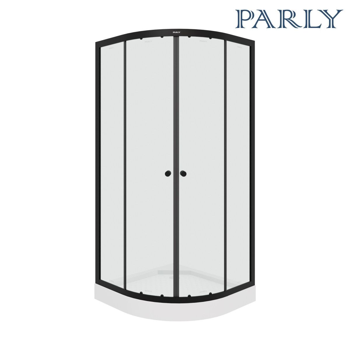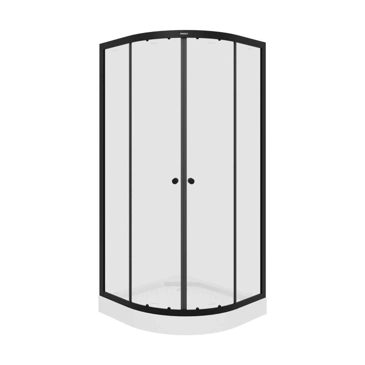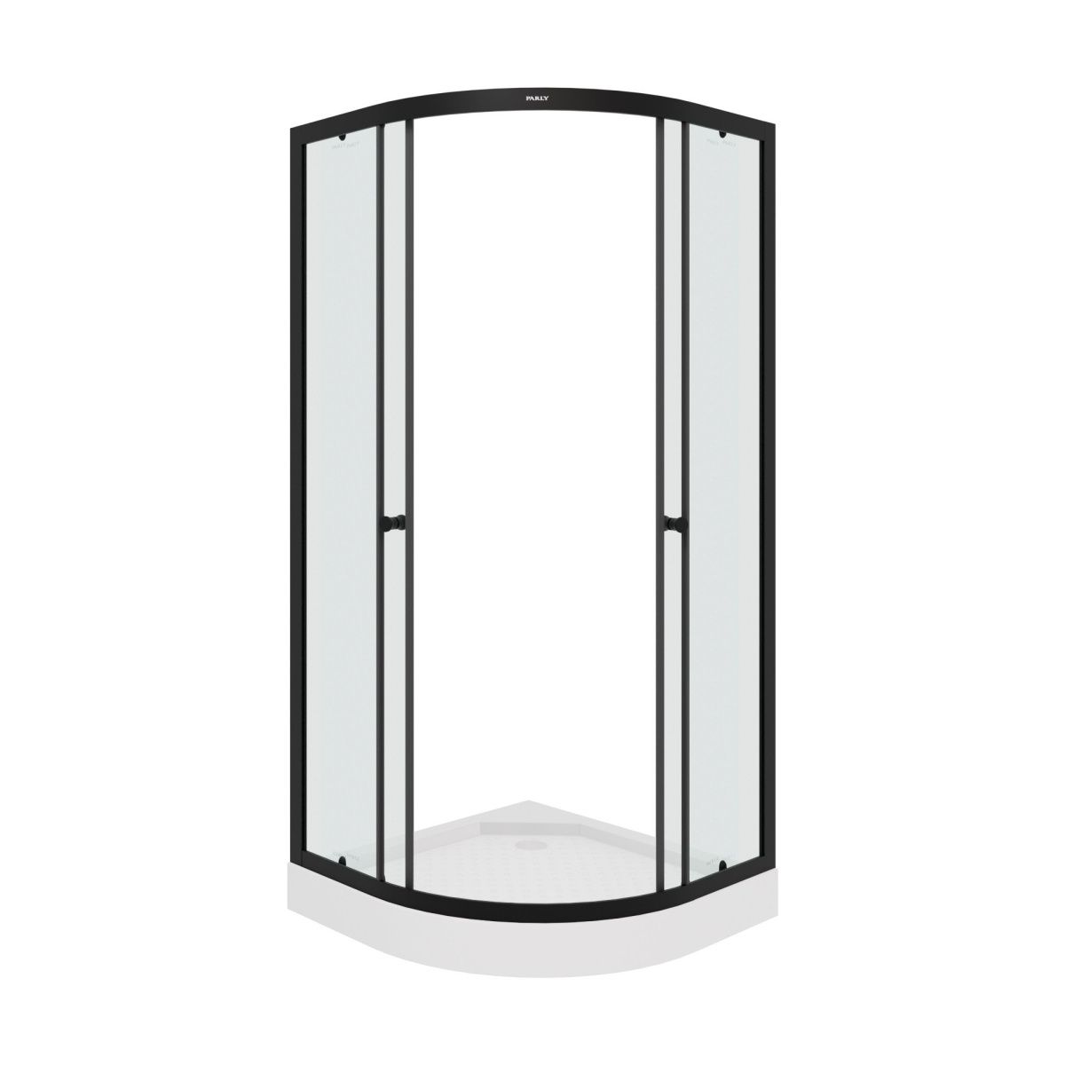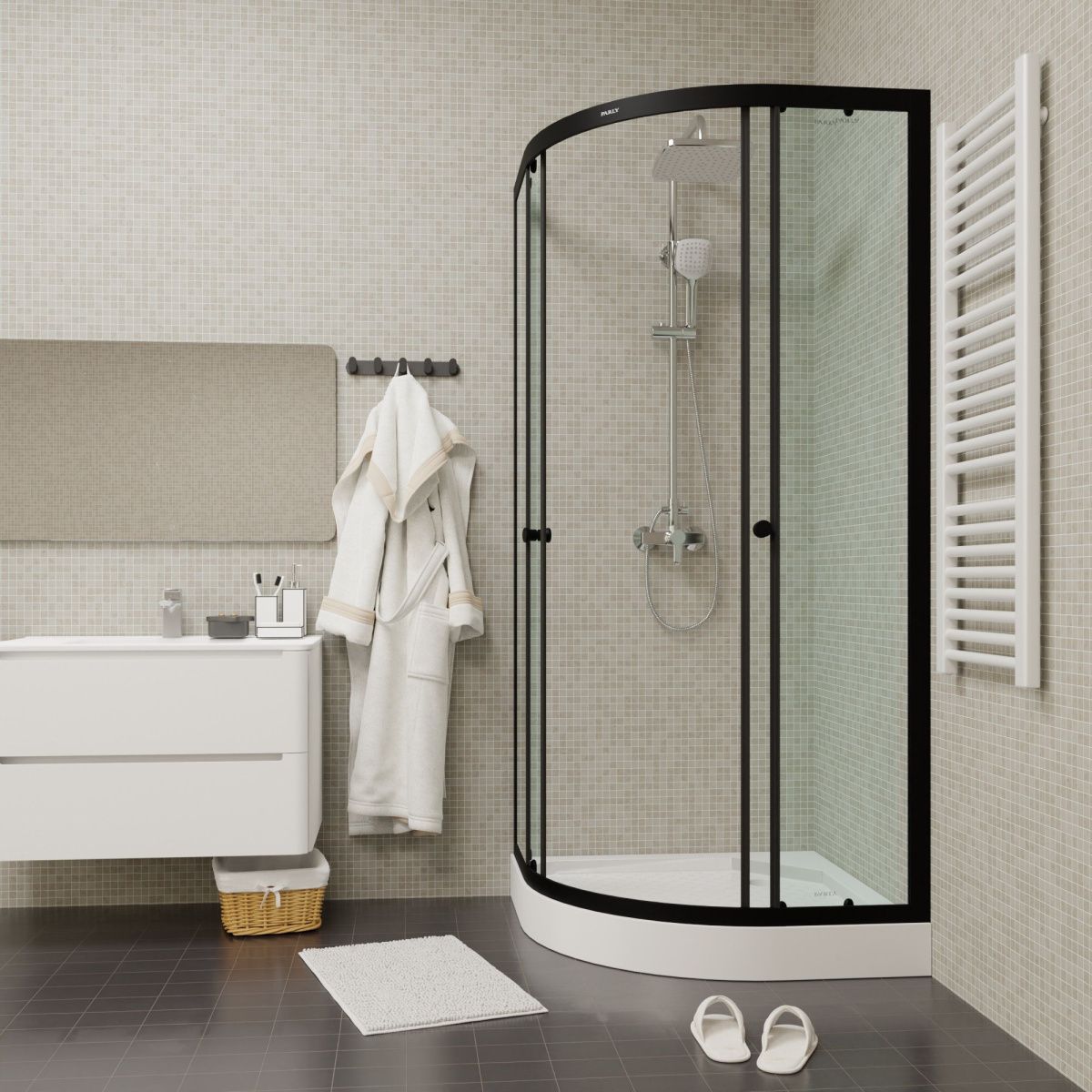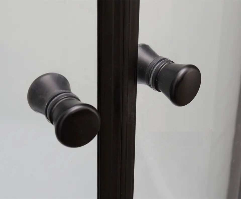 Сочетание черного профиля и прозрачного стекла отлично впишется в современную ванную комнату. Уголок полукруглой формы с раздвижными дверями экономит полезную площадь в санузле.