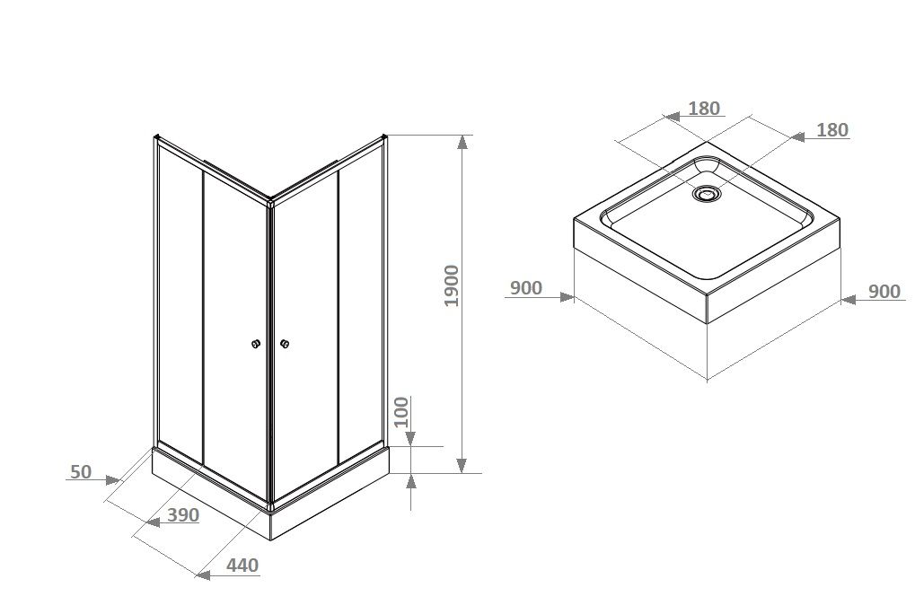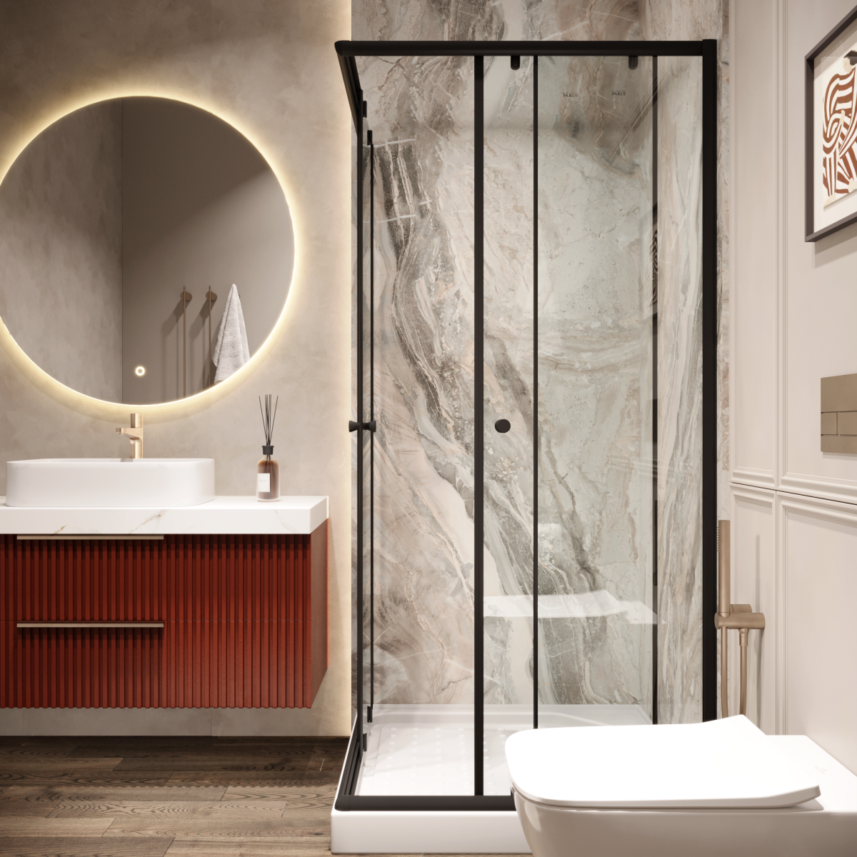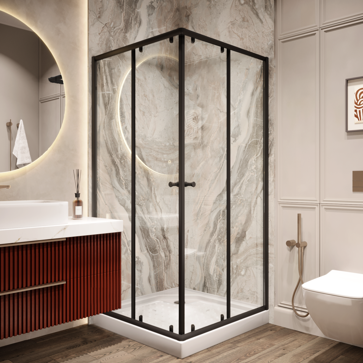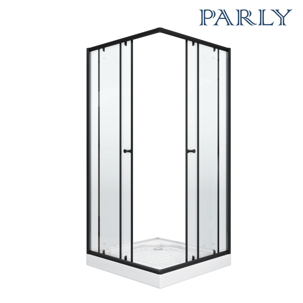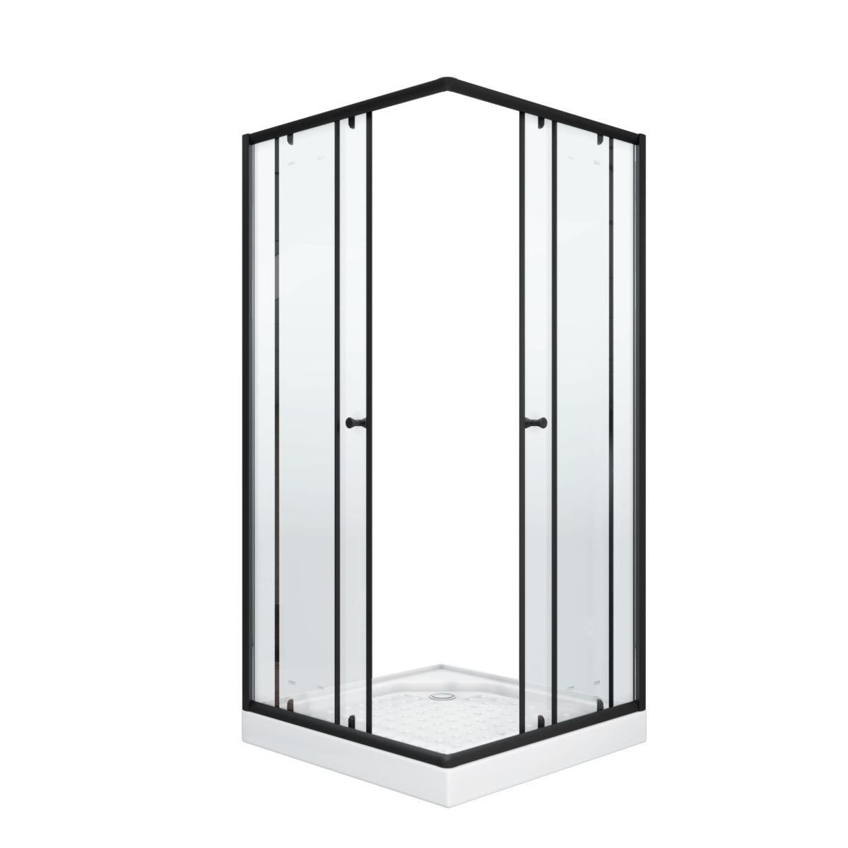Компактная стильная модель с угловым входом. Прямые черные линии в сочетании с прозрачным стеклом подчеркивают современный дизайн. Раздвижные двери на одинарных роликах ходят плавно, не соскакивают с направляющих.