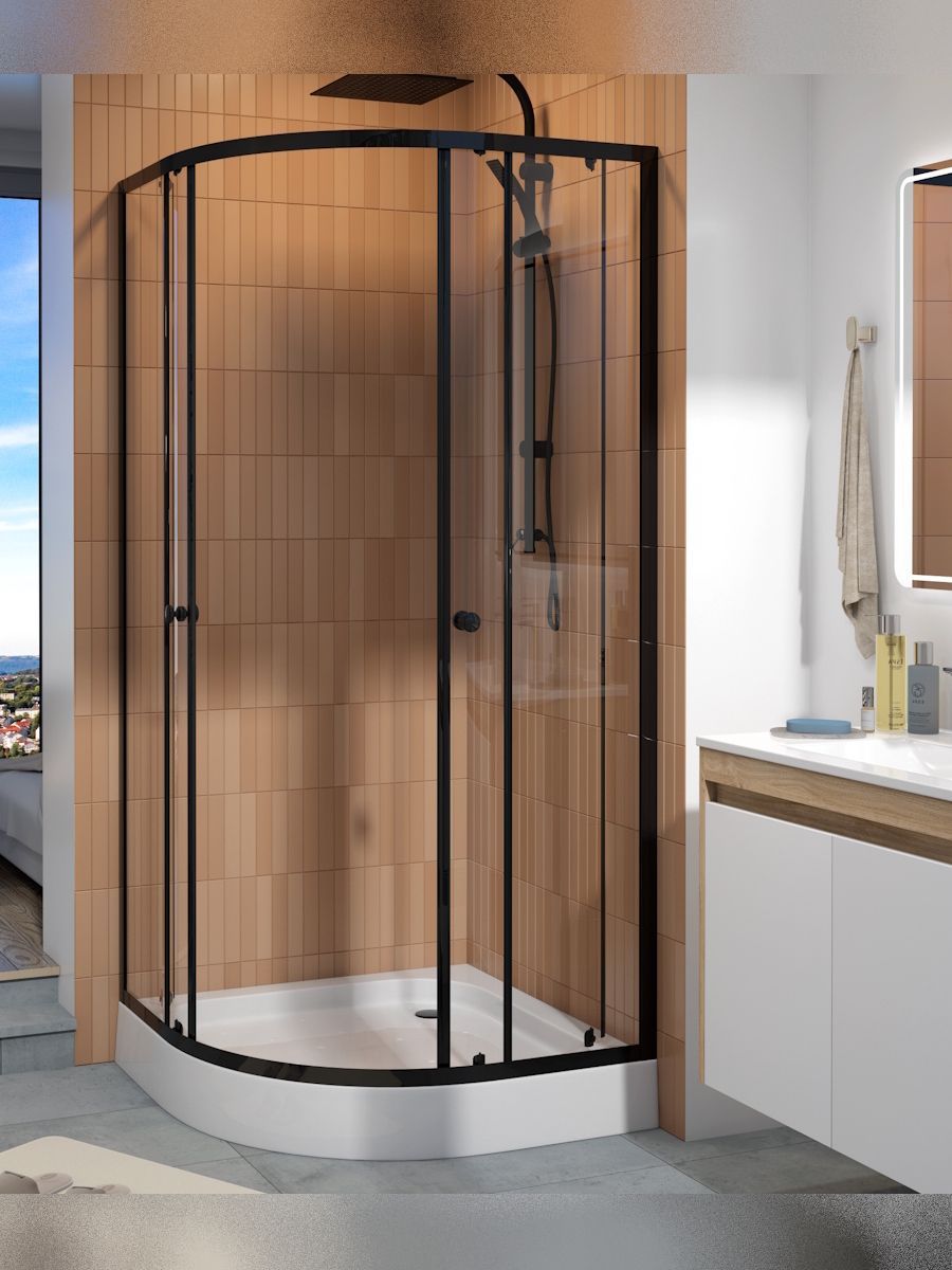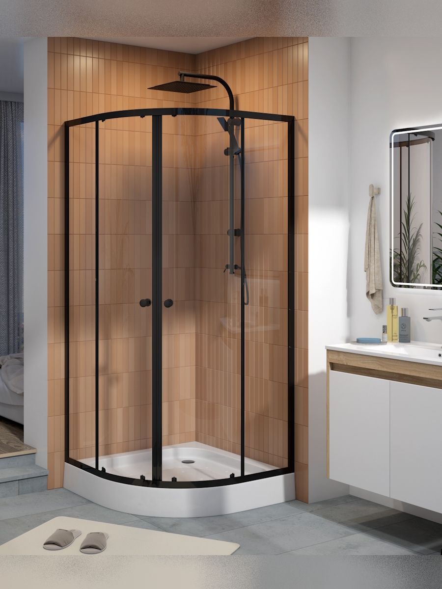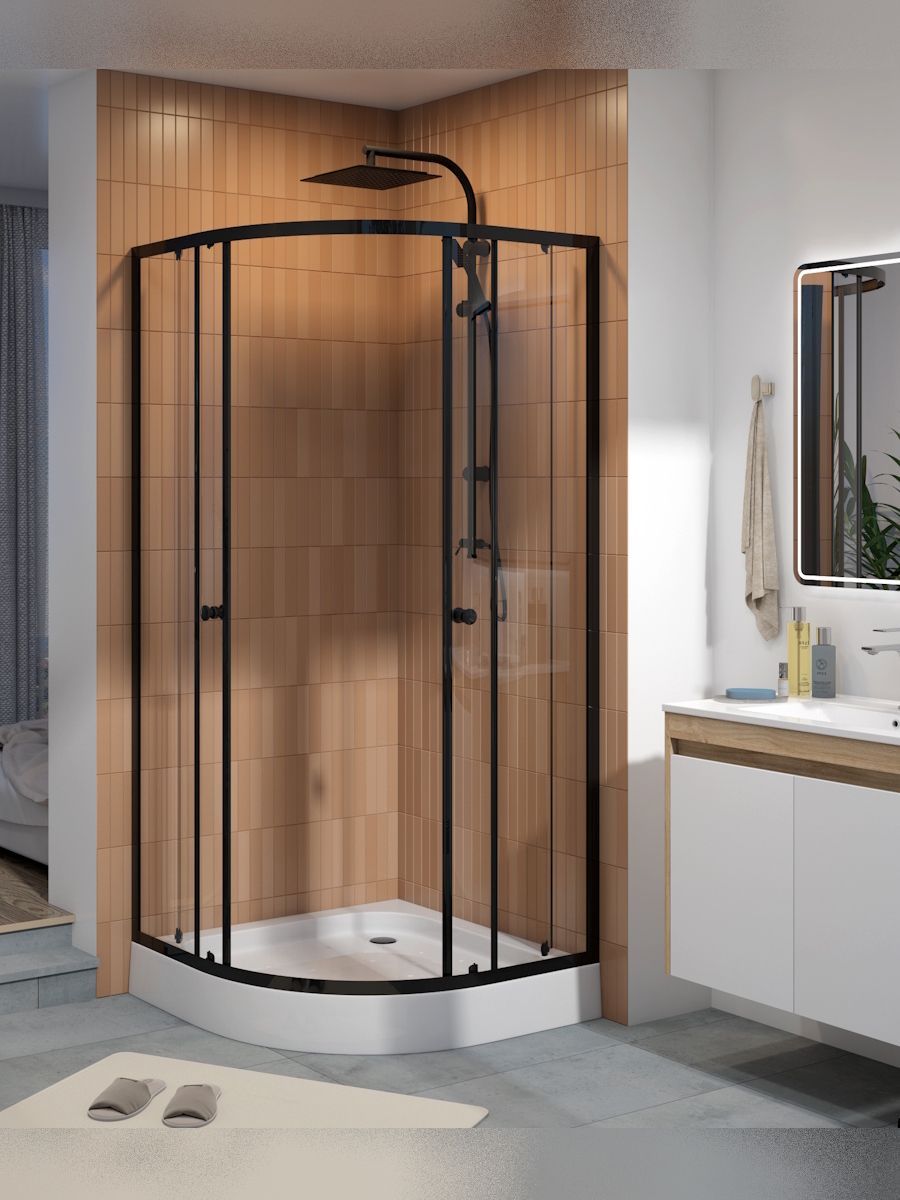 Душевой уголок 90х90 с поддоном Teymi Lina T00504 — современное решение для тех, кто ценит стиль, удобство и эргономичное использование пространства. Конструкция с универсальной ориентацией идеально подходит для установки в угол ванной комнаты, позволяя максимально эффективно задействовать площадь. Прозрачные закалённые стеклянные панели толщиной 5 мм придают интерьеру лёгкость и визуально расширяют помещение. Особое внимание уделено дизайну: матовый чёрный алюминиевый профиль подчёркивает современный характер интерьера, создавая выразительный контраст и подчёркивая детали отделки. Раздвижные двери на роликах открываются плавно и бесшумно, обеспечивая удобный доступ внутрь. Поддон из акрила высотой 125 мм укомплектован шестью регулируемыми ножками, что позволяет точно настроить уровень на любом типе пола. Антискользящее покрытие повышает безопасность при использовании, а регулировка устойчивости до 30 мм обеспечивает адаптацию даже к неровным поверхностям. Комплект поставки включает сифон клик-клак для простого и надёжного слива. Антиизвестковое покрытие облегчает уход за стеклянными поверхностями, предотвращая образование налёта и сохраняя безупречный внешний вид. Ключевые особенности: ·         Прозрачное закалённое стекло 5 мм для надёжности и визуальной лёгкости ·         Чёрный матовый алюминиевый профиль для стильного акцента ·         Раздвижные двери на качественных роликах для комфорта при открывании ·         Низкий акриловый поддон с антискользящей поверхностью и шестью регулируемыми опорами ·         Универсальная ориентация для гибкой установки ·         Антиизвестковое покрытие для лёгкой очистки и долговечного блеска Комплектация: профили, акриловый поддон, сифон клик-клак, стеклянные дверные и глухие секции, силиконовый уплотнитель, ролики, крепёж, инструкция.